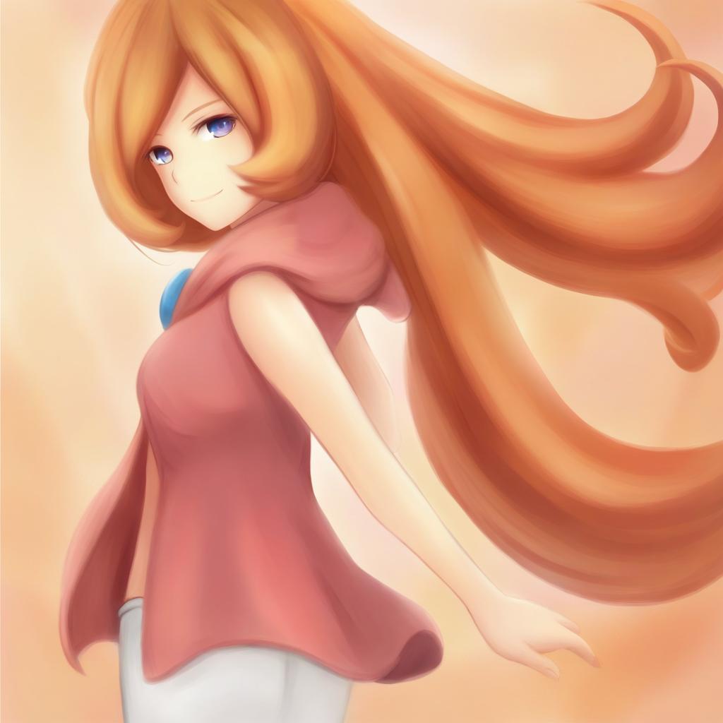 This digital anime-style illustration features a young woman with long, flowing orange hair that extends past her waist. She has blue eyes and a calm expression. She is wearing a pink, sleeveless top with a hood and a white skirt. The background is a soft, gradient orange, enhancing the warm tones of her hair and top. The character is turned slightly to the side, with her head tilted, giving a sense of movement to her hair. The art style is characterized by smooth, flowing lines and a gentle color palette, creating a serene and ethereal atmosphere.