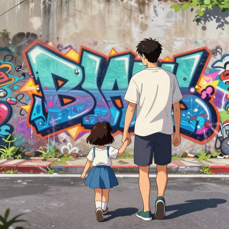 Graffiti Art A dad and a daughter holding hands and walking together on a road, view from the back, anime style, 8k,