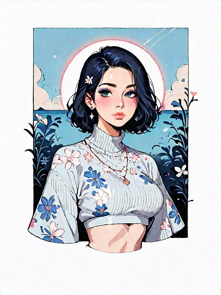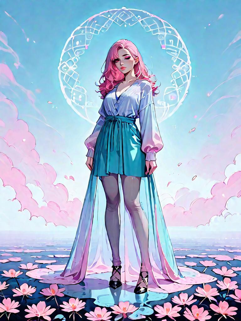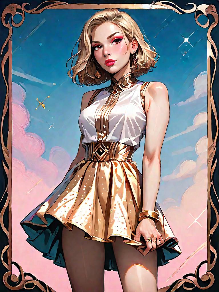 Digital artwork of a stylish anime girl with short blonde hair and green eyes. She is wearing a teal ribbed bodycon dress with long sleeves and a high neck, accentuated by a wide black corset belt. The background features a soft, ethereal blue sky with clouds and circular light elements, creating a dreamy and slightly fantastical atmosphere.