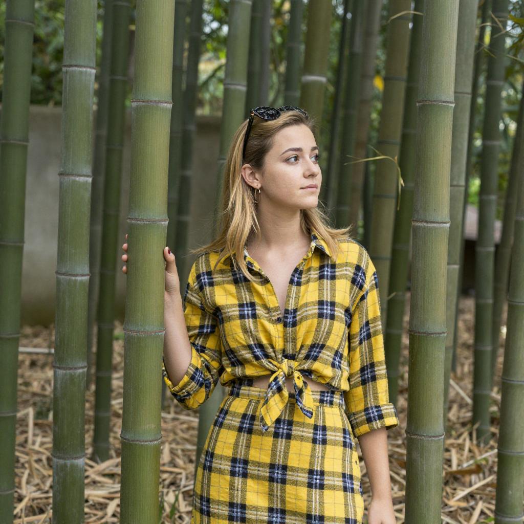 Photograph of a young woman with light blonde hair, wearing a yellow and black plaid tied-up shirt and matching skirt, standing among tall green bamboo stalks. She holds a bamboo stalk with her right hand, looking to the right. Her hair is loose, and she wears sunglasses on her head. The background is dense with bamboo and dry leaves.