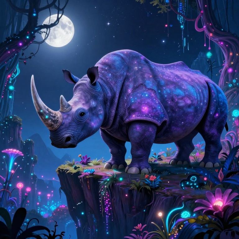 Digital artwork of a cosmic rhinoceros standing on a glowing, cliff-like rock under a bright full moon. The rhino's purple, textured skin is adorned with star-like patterns and bioluminescent accents in blue, pink, and purple. Surrounding the rhino are vibrant, neon-colored plants and glowing fungi, set in a mystical, bioluminescent forest. The background features dark, twisted trees and a starry night sky, enhancing the magical, otherworldly atmosphere. The rhino's large, white horns and detailed texture contrast with the vivid, fantastical environment.