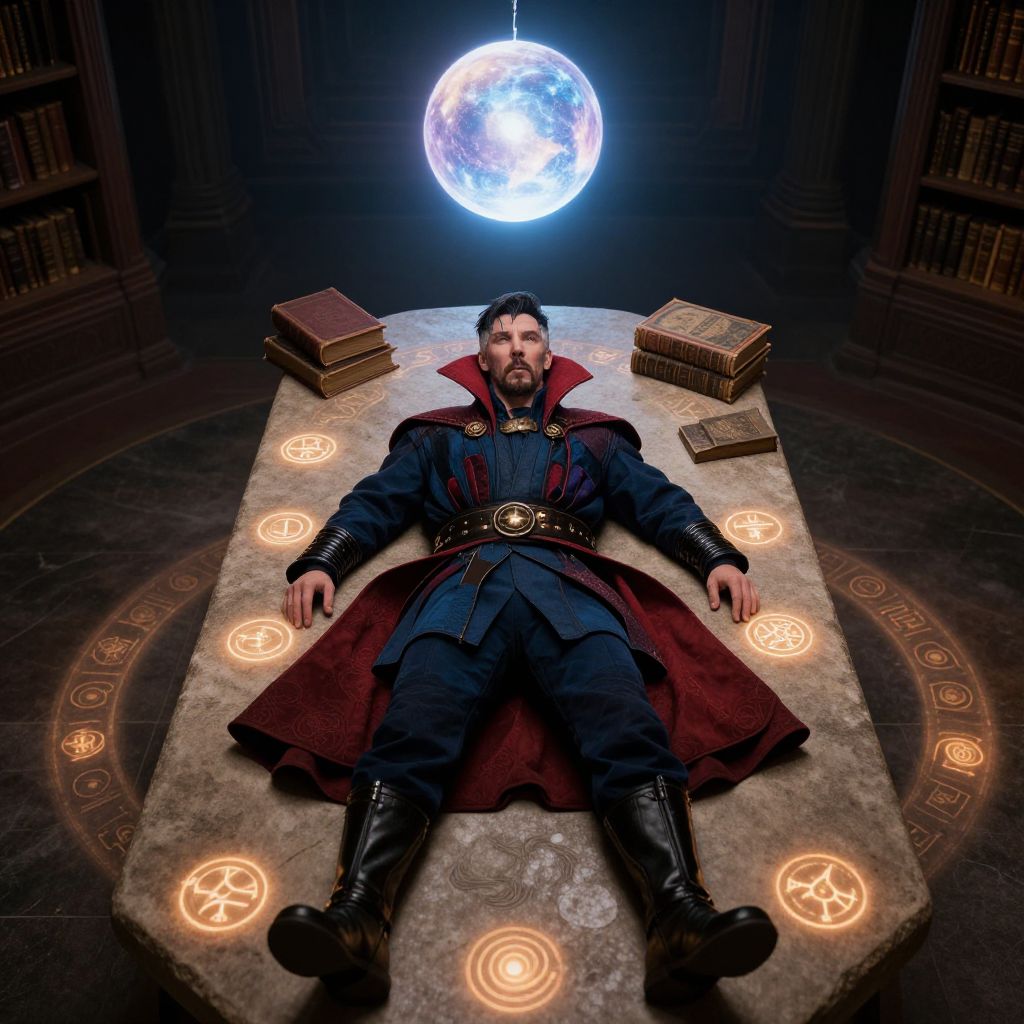 Doctor Strange's costume laid out on a stone table in a mystical library, with ancient tomes and glowing runes scattered around, under the light of a celestial orb hovering above.