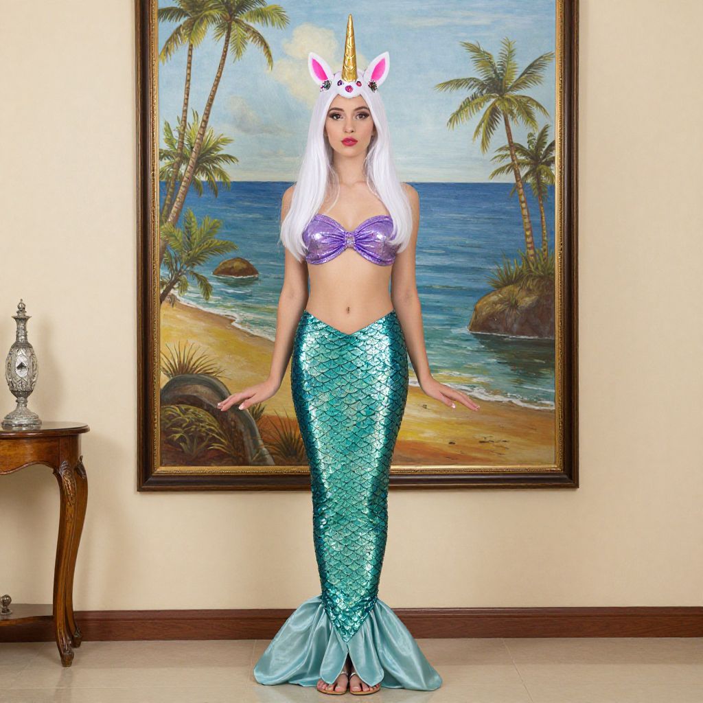 "Mermaid Unicorn Costume, dressed in a mermaid costume standing in front of a painting"