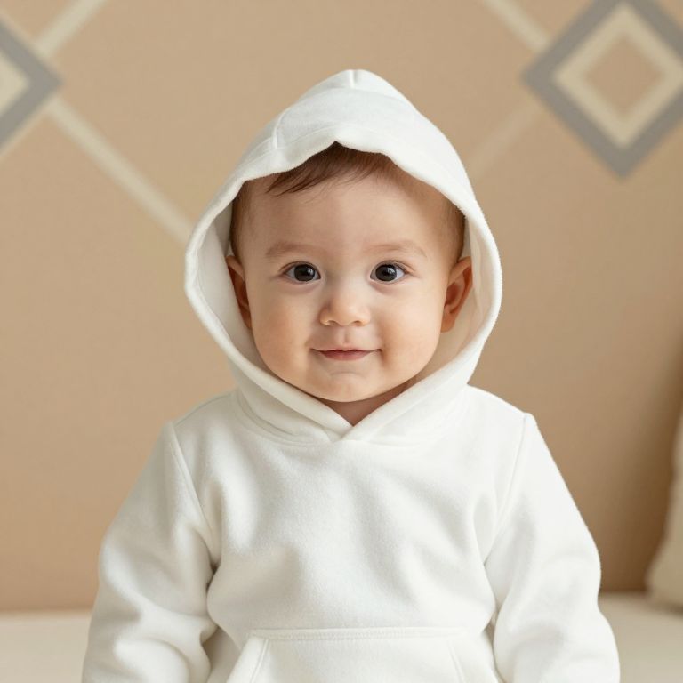 A baby is wearing a white outfit with a hood and a zipper on the front, standing confidently with their hands on their hips. The baby has soft, round cheeks, large curious eyes, and a slightly tilted head, adding a playful and innocent expression. The baby's skin is smooth and slightly glowing, with a natural, healthy hue, and their small hands are slightly clenched in a playful pose. The background is a sunny, warm indoor setting with soft, diffused lighting from large windows, casting gentle shadows and highlighting the baby's cheerful and active posture. The room features a cozy, homey atmosphere with light wooden furniture, a soft rug, and a few scattered toys, enhancing the warm and inviting mood. The overall tone is joyful, tender, and full of life, capturing the baby's innocence and confidence in a bright, natural environment.