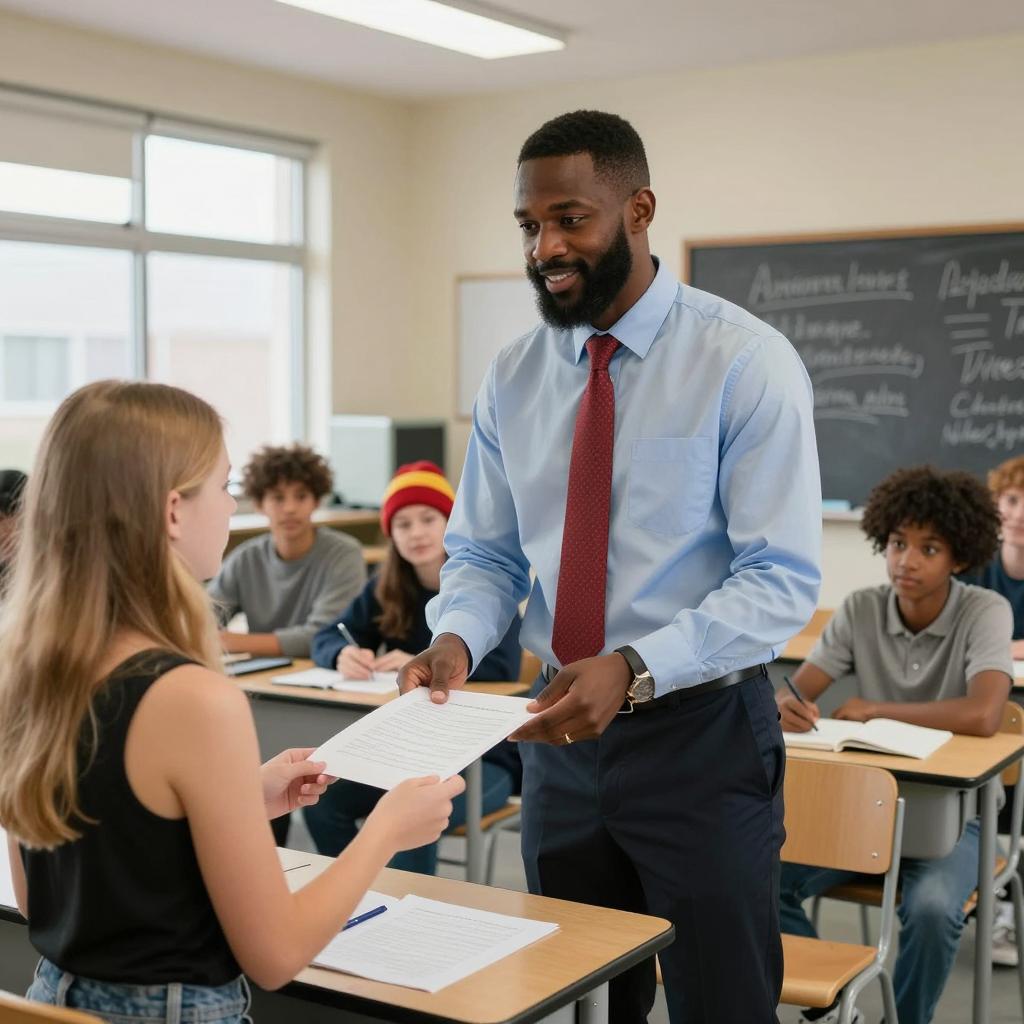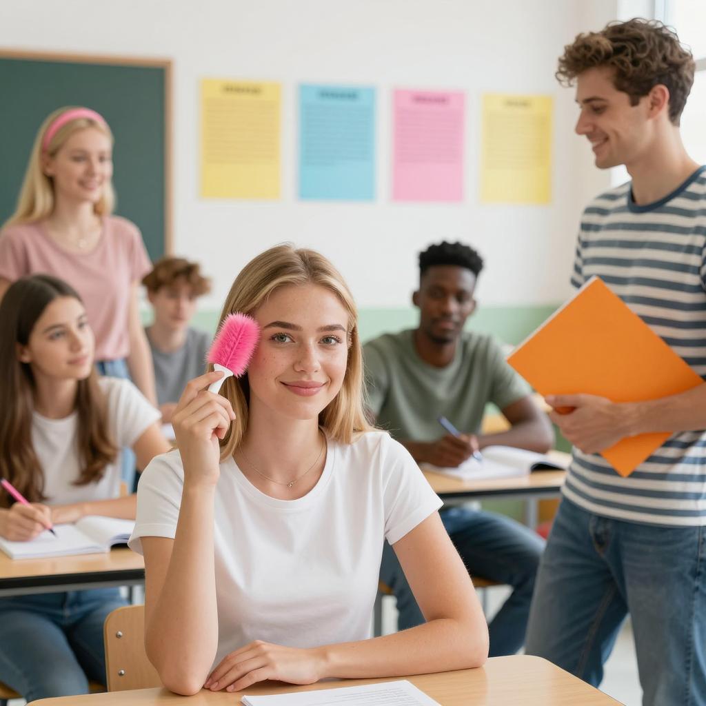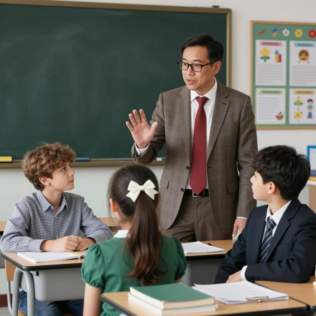 Group of eleven children standing in a classroom. Boys and girls, various ethnicities. Casual clothing: checkered shirts, dresses, overalls. Brown wooden floor, rows of empty desks in background. Children stand in a line, some looking at camera, others down. Mixed expressions: neutral, slight smiles. Daylight from windows on left. Shoes: sneakers, loafers, sandals. Hair: short, long, braided. Teacher partially visible on left.