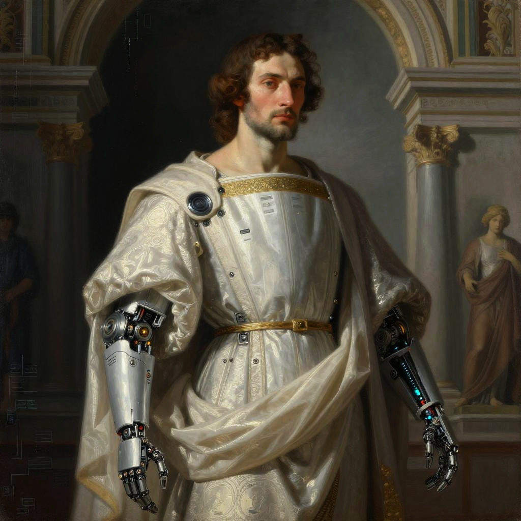 AI renaissance painting depicting a noble figure draped in traditional robes, augmented with subtle cybernetic enhancements, deep shadows and soft glowing highlights, set against a grand architectural backdrop reminiscent of the Italian Renaissance with a digital age influence.