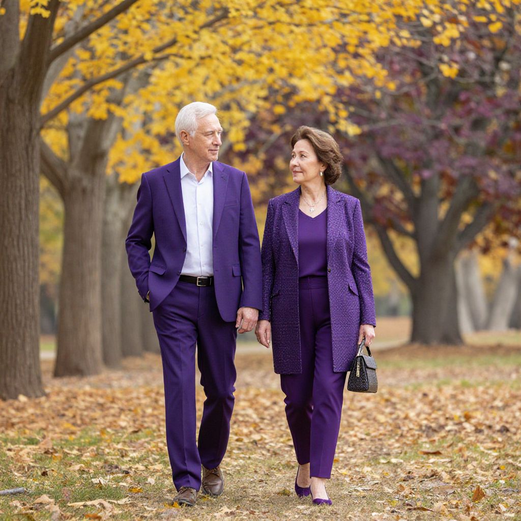 A stylish older couple strolls hand in hand through a beautiful autumn park, surrounded by vibrant yellow and purple trees. The man's fashionable purple suit complements the woman's elegant outfit, showcasing their graceful presence in a picturesque setting.