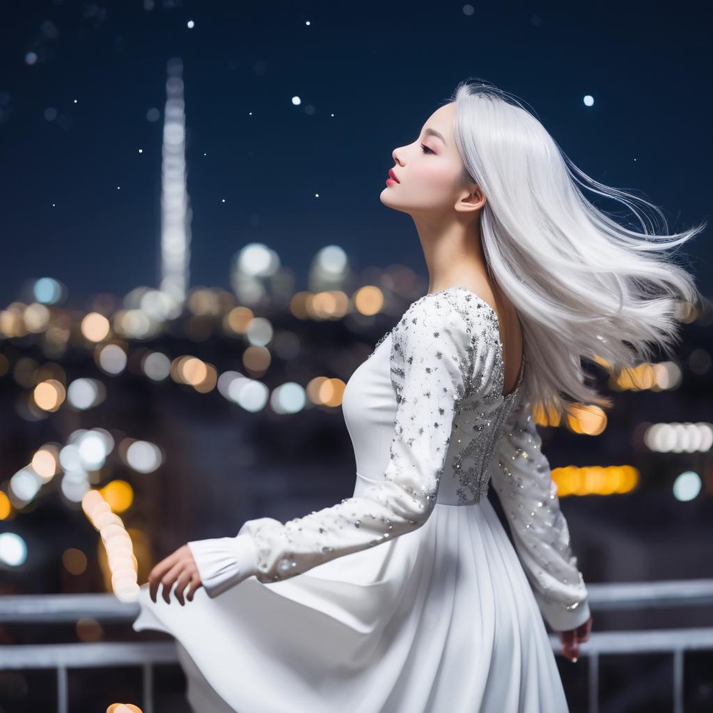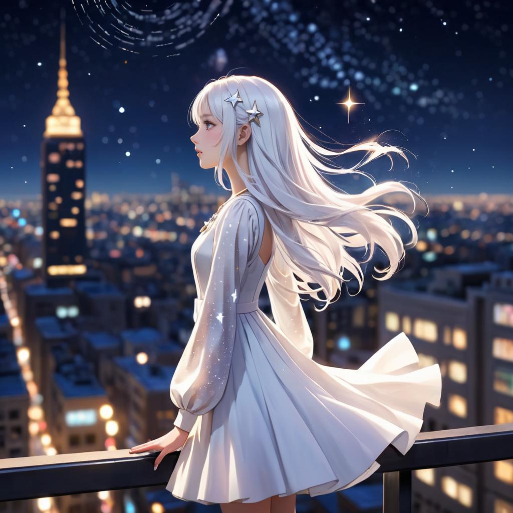 Young woman with long white hair wearing a white dress with sheer, embellished sleeves standing outdoors at night, gazing up at a star-filled sky above a cityscape with blurred lights.