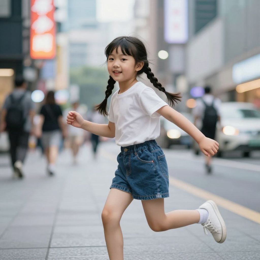 Asian little girl with braided hair, dressed in modern casual clothes, running through a bustling city street, neon lights in the background, energetic and lively urban scene