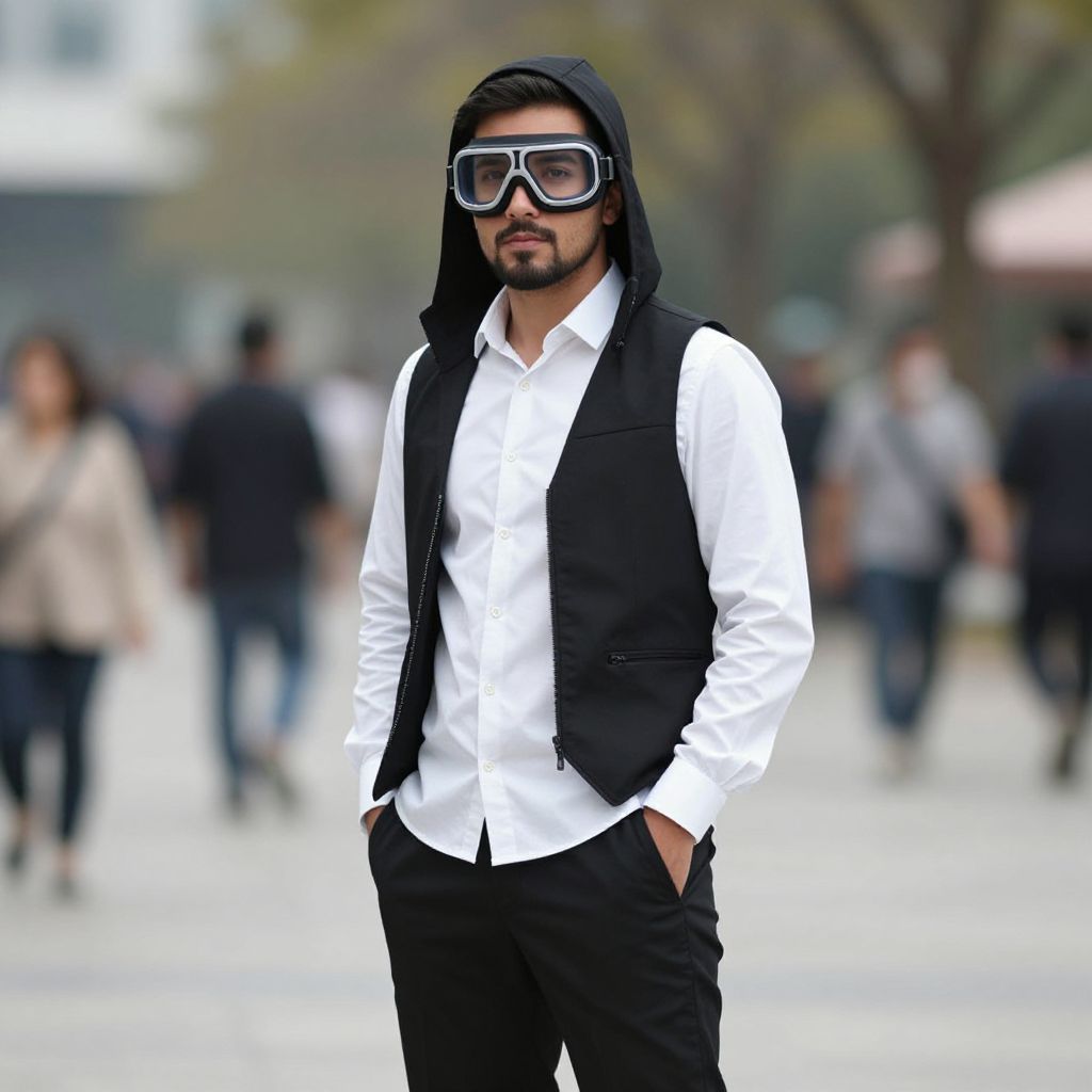 "novelty adult costume, 1boy, male focus, solo, blurry background, blurry, facial hair, goggles, outdoors, pants, shirt, vest, hand in pocket, white shirt, black pants, jacket, hood Realistic photo of casual sexy person with pretty face"