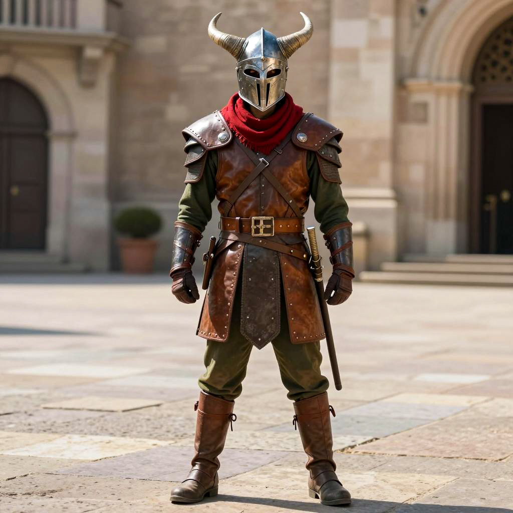 Willi smith costume, photograph of Black man standing, wearing medieval fantasy armor, tan and dark green, long black cloak, brown boots, black gloves, serious expression, stone wall with detailed carvings in background, two green potted plants on the sides, natural light, full body shot, realistic style, detailed ures, slightly shaded background, tall and muscular build, medium skin tone