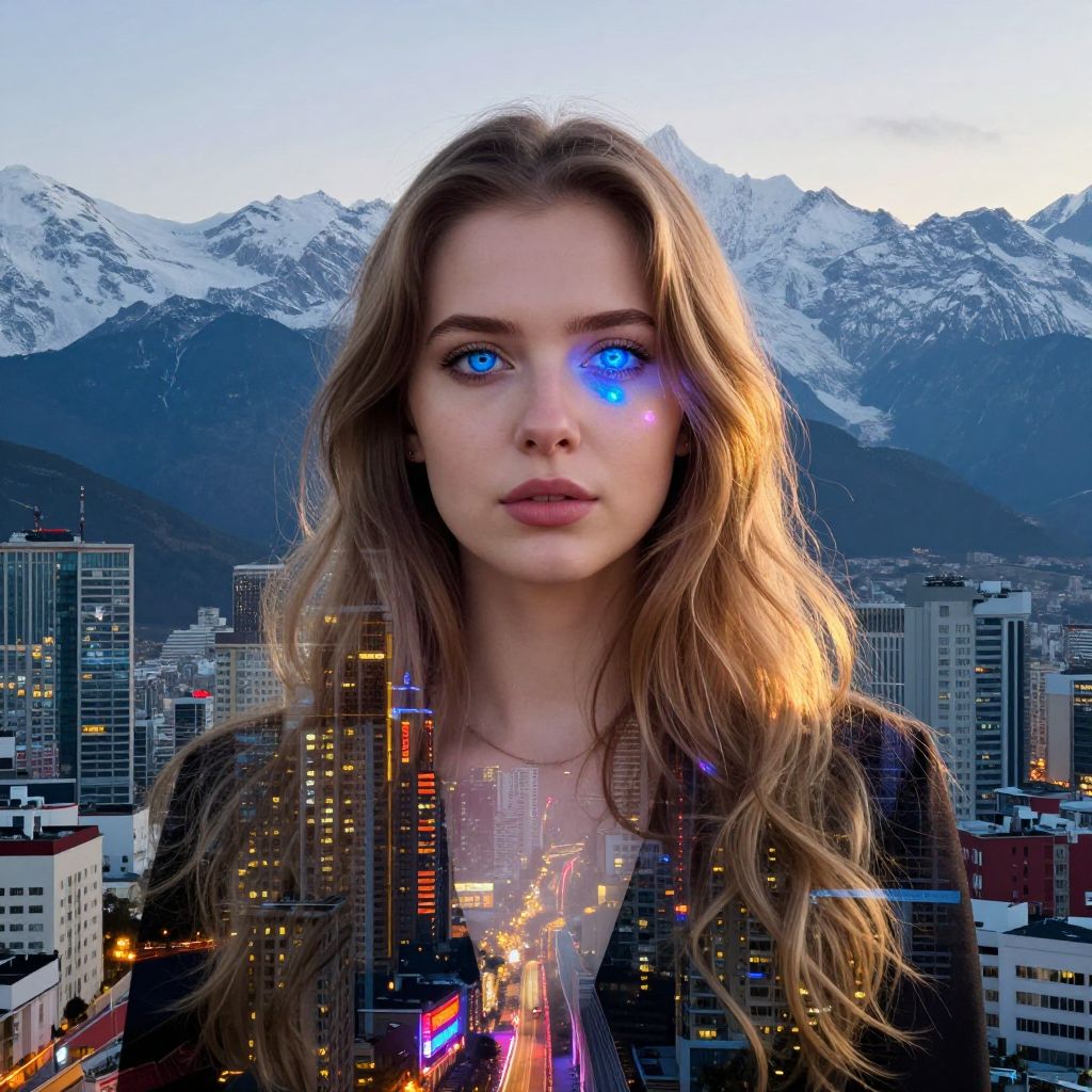 A captivating double exposure portrait fuses an enigmatic figure with vibrant cityscapes and serene mountain landscapes. A young woman, the focal point, stands at the intersection of towering skyscrapers and majestic snow-capped peaks. Her piercing blue eyes reflect the neon lights of the city, while her waterfall-like hair cascades, framed by a soft golden glow from the setting sun. Seamlessly merging with both environments, her form becomes a bridge between the urban and the natural. This image, a harmonious blend of vibrant city life and tranquil mountain scenes, invites viewers to reflect on the delicate balance between civilization's progress and nature's enduring beauty.