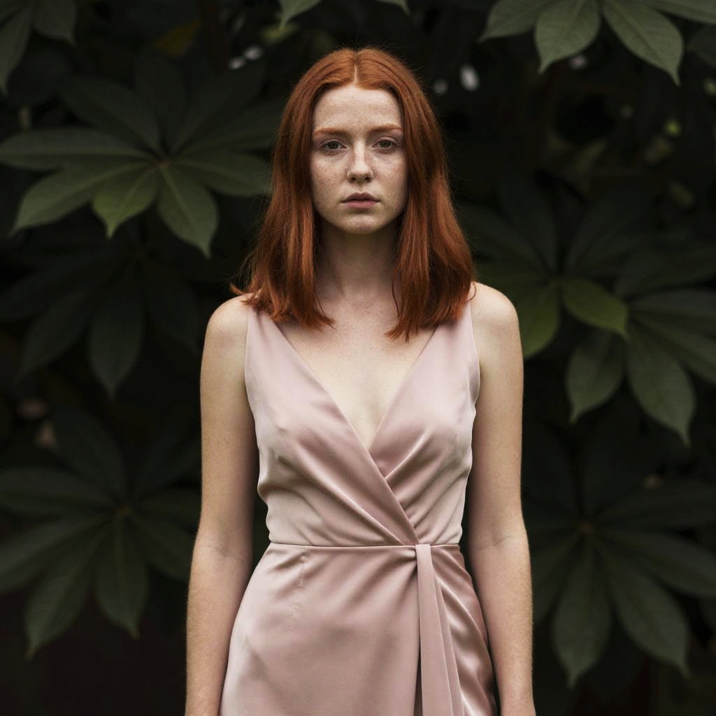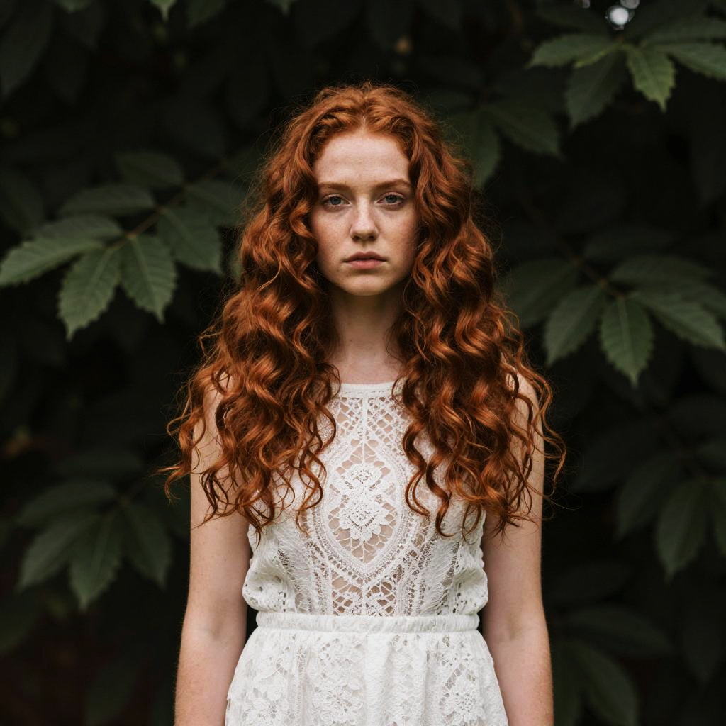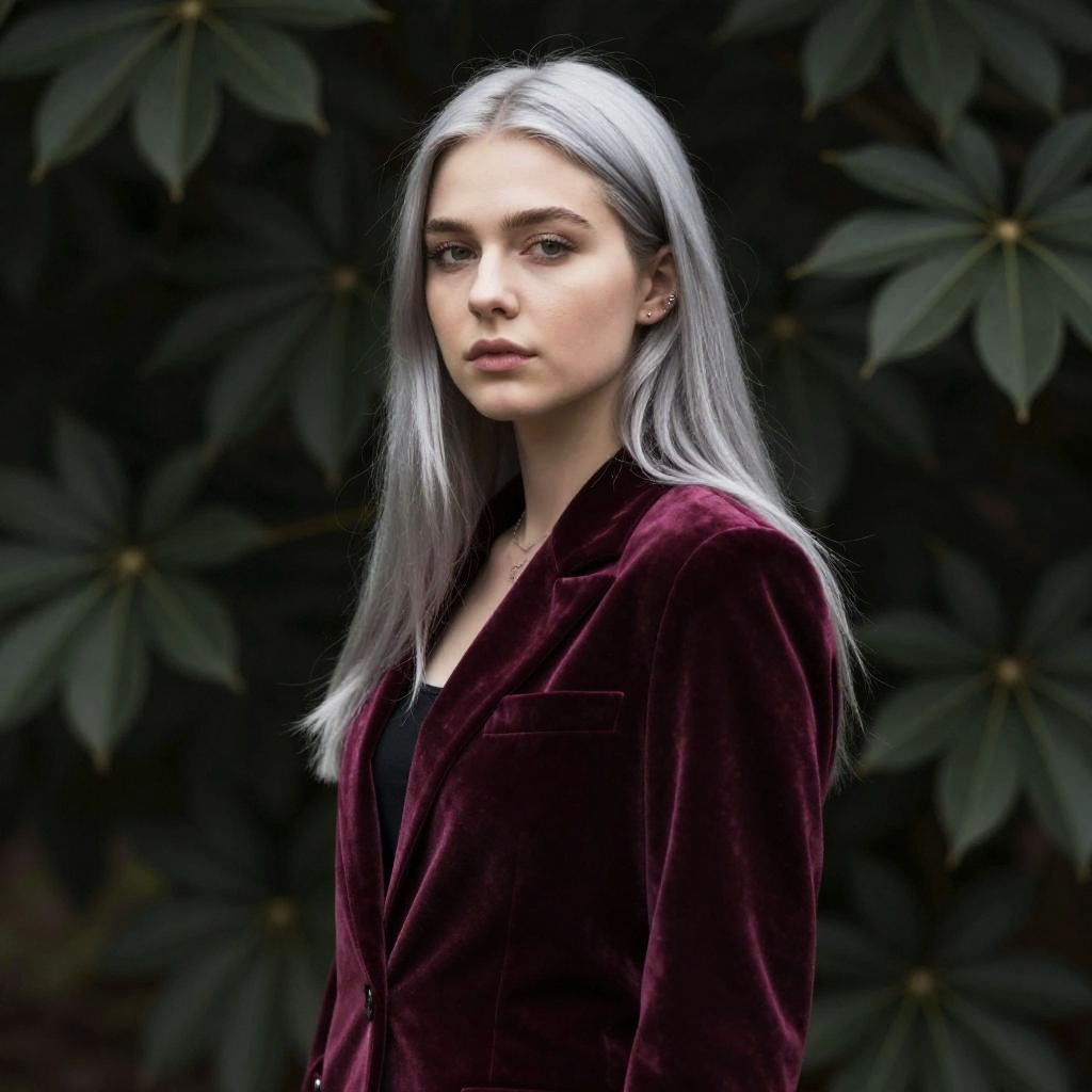 A moody portrait of a young woman with short tousled copper hair wearing a dark green corduroy jacket standing in front of a blurred green leafy background, soft natural lighting, shallow depth of field