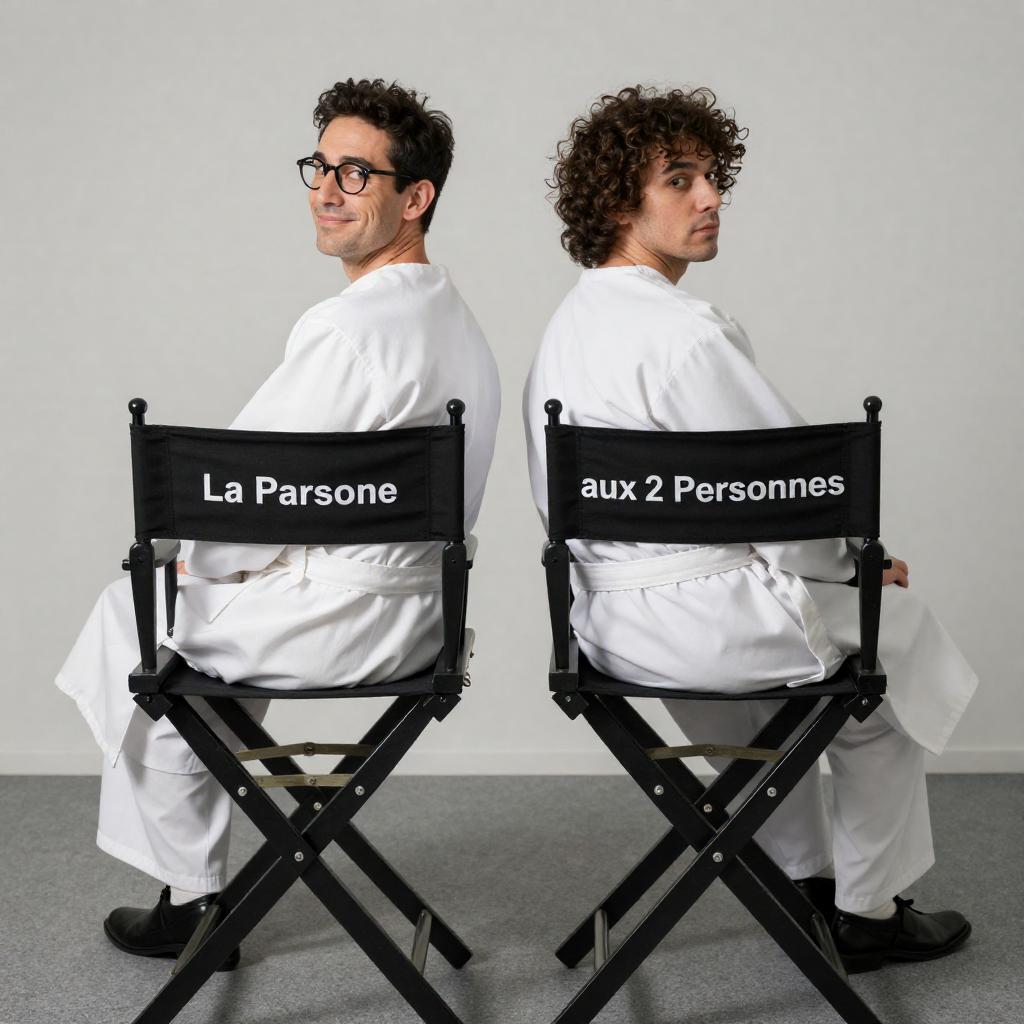 Photograph of two men in white robes sitting back-to-back on black director's chairs. Left man with glasses, dark hair, slight smile. Right man with curly hair, neutral expression. Black chair backs read "La Persone" and "aux 2 Personnes." Light gray background, gray carpet. Men's hands touch, chairs face each other.
