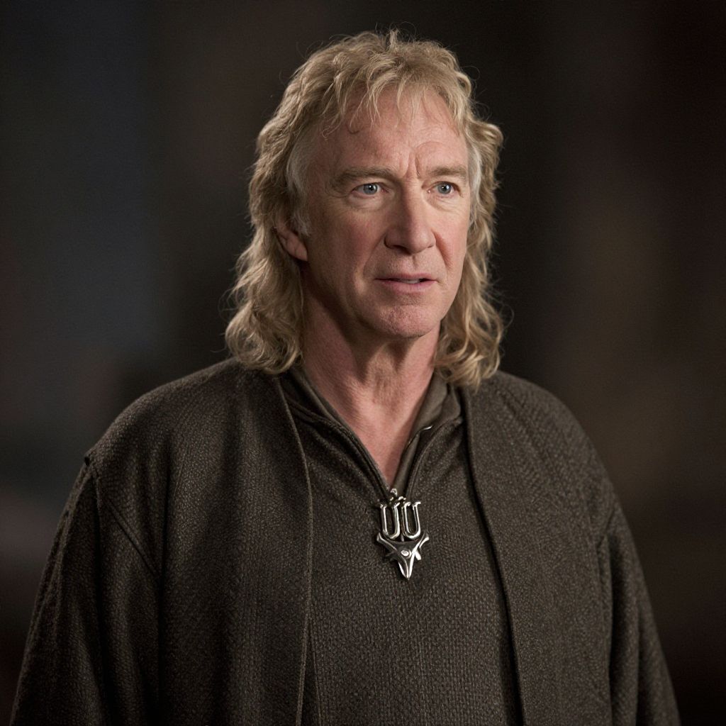 Photograph of middle-aged white man with wavy blonde hair, wearing a dark, textured robe with a silver pendant, looking serious against a dark,