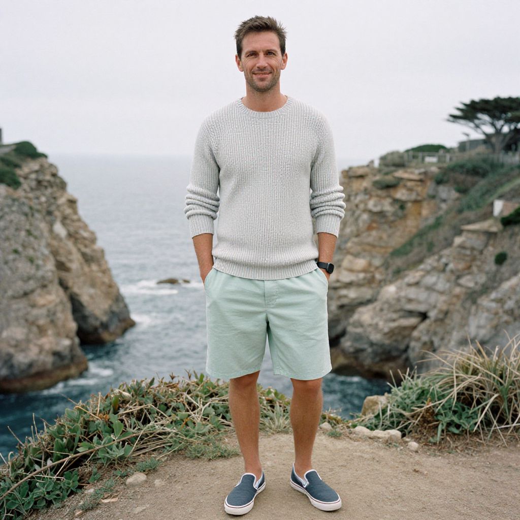 A man, light grey knit sweater, pastel green shorts, slip-on canvas sneakers, coastal cliffs, ocean breeze, Ilford film stock, relaxed smile, fresh and casual vibe. Man has masculine face and piercing eyes