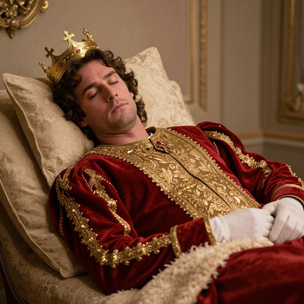 Photograph of a Caucasian man with curly dark brown hair, wearing a gold crown and a rich, red velvet robe adorned with intricate gold embroidery and white fur trim. He is reclining on a plush, cream-colored pillow in an opulent room with ornate, gold-trimmed walls. His eyes are closed, and his expression is calm and regal. He is dressed in white gloves, adding to the monarchic appearance. The lighting is warm, highlighting the luxurious textures and colors of the robe and surroundings. The overall scene conveys a sense of royalty and relaxation.