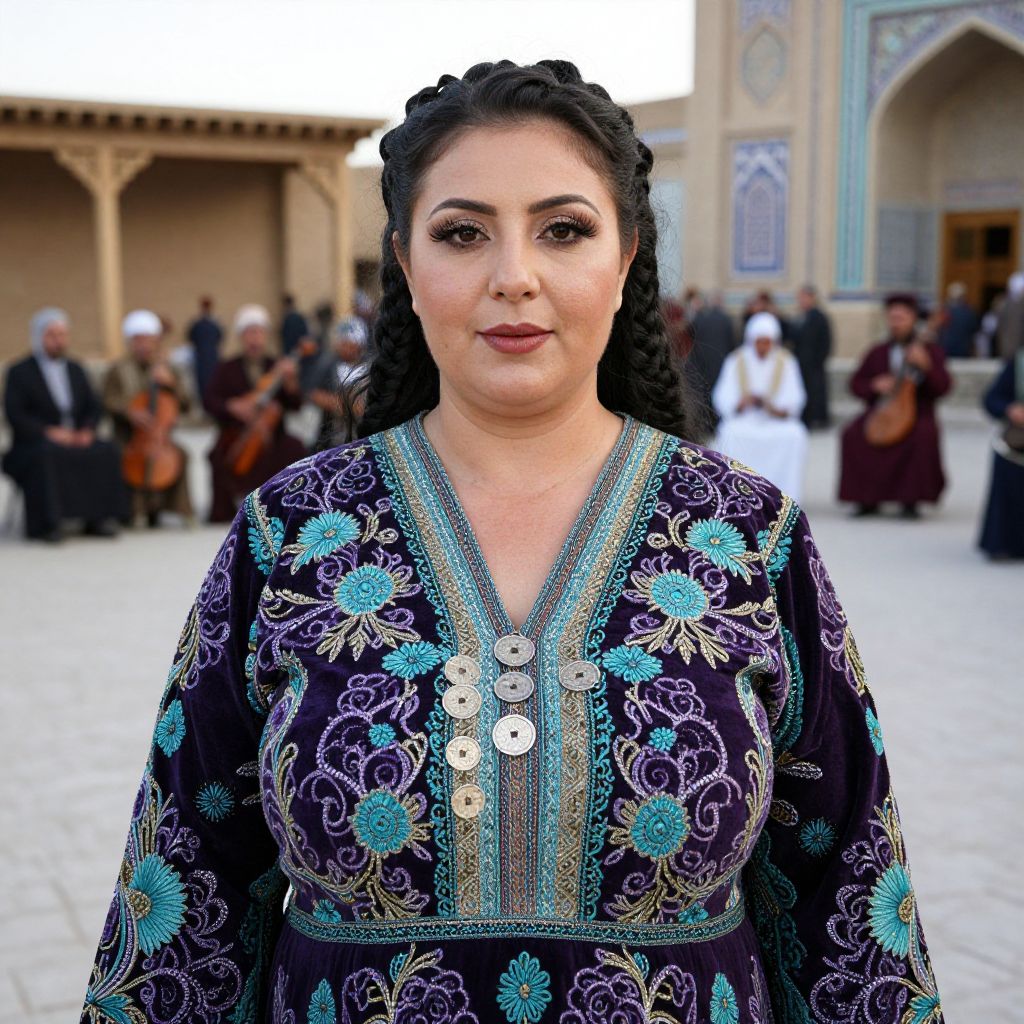 A middle-aged Afghan woman with a strong, defined face, dark eyes with slight kohl lines, and braided hair wearing a richly embroidered traditional dress featuring detailed patterns of ancient coins and floral designs in deep purple and turquoise, standing in a bustling village square during a festival in Mazar-e-Sharif, traditional setting with local musicians in the background, realistic photo style. The woman has big tits and cute face