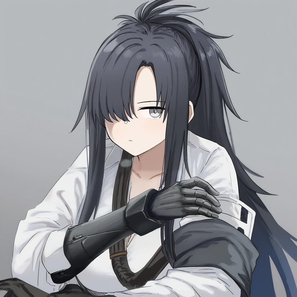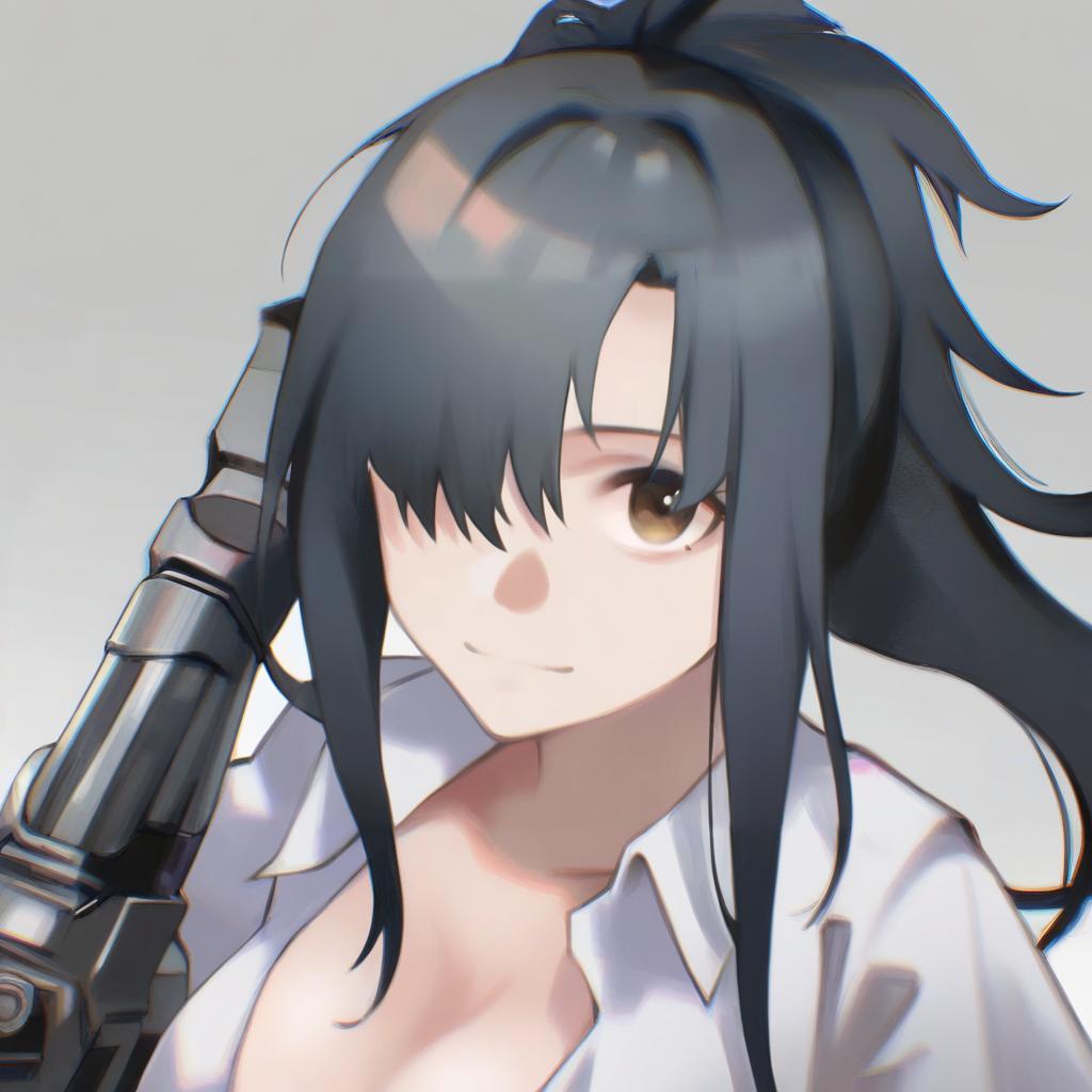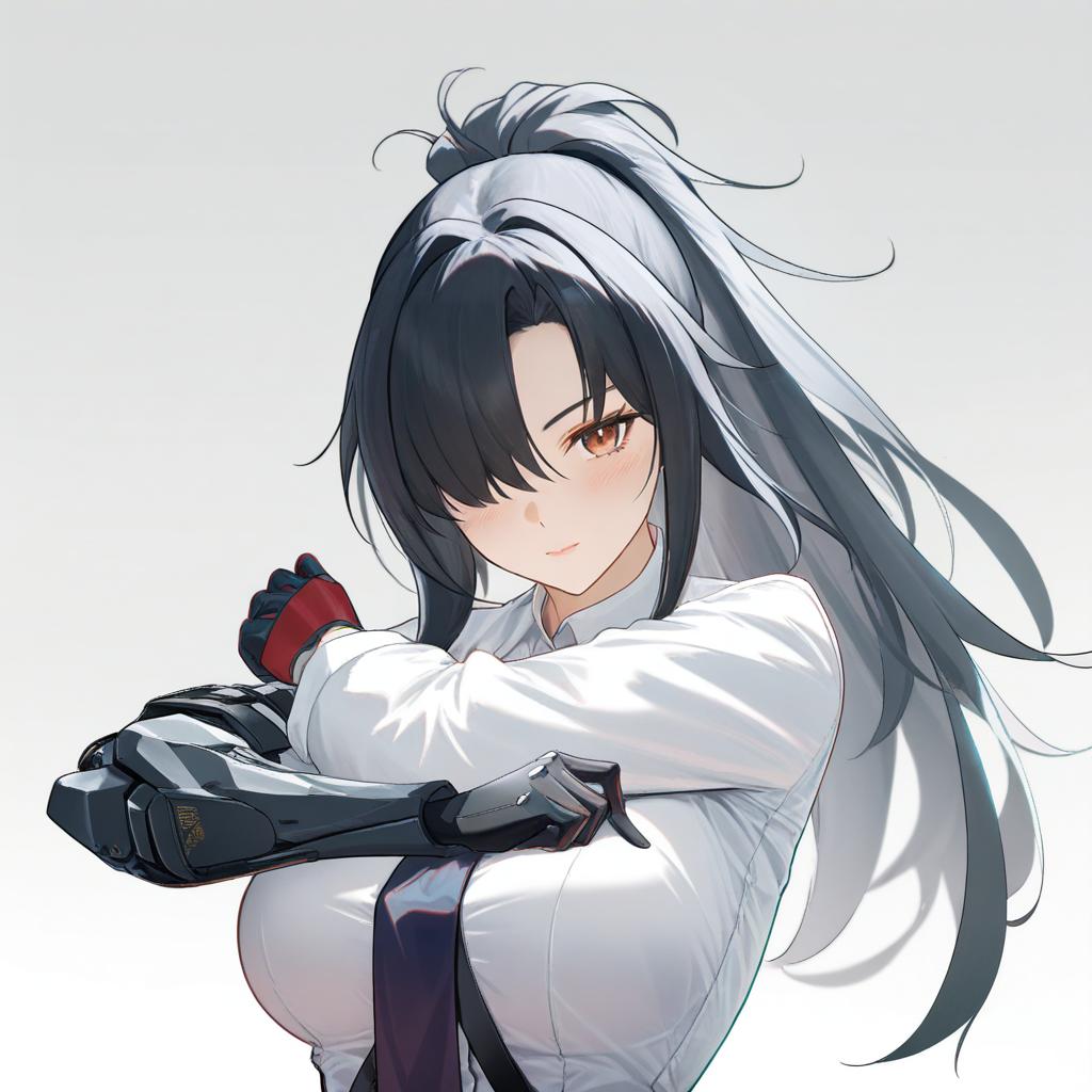 Angelia (girls' frontline), girls' frontline, 1girl, brown eyes, hair over one eye, black hair, long hair, ponytail, large breasts, scar on face, white shirt, long sleeves, single mechanical arm, by artist enjaku izuku, leet