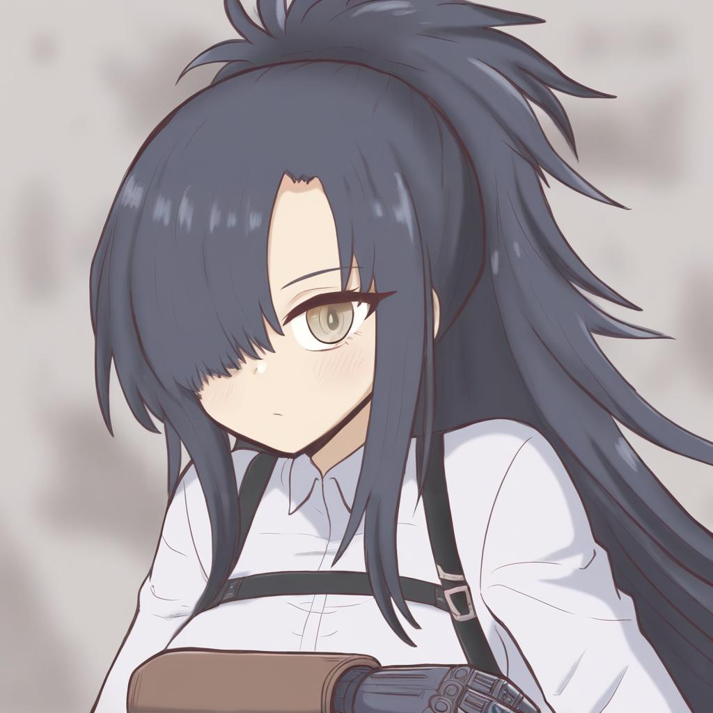 Digital anime-style illustration of a young female character with long black hair tied in a ponytail, partially covering one brown eye. She wears a white collared shirt with long sleeves, a dark tie, and sports a single mechanical arm. The character has a soft expression and features a subtle scar on her face.