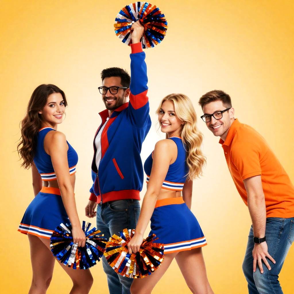 Photograph of four people in dynamic poses against a gradient yellow-orange background. Left: nude woman with long brown hair, athletic build, looking back. Center: man in blue and red jacket, black-framed glasses, short black hair, arm raised, smiling. Right: man with glasses, blue jeans, leaning forward, smiling. Rightmo BREAK blonde woman in blue and orange cheerleader outfit, looking back over shoulder, holding pom-poms. Cheerful, energetic, playful atmosphere., blonde woman, blue and orange cheerleader outfit, holding pom-poms, looking back over shoulder, cheerful expression, energetic pose, playful atmosphere, vibrant colors, dynamic lighting, sharp focus
