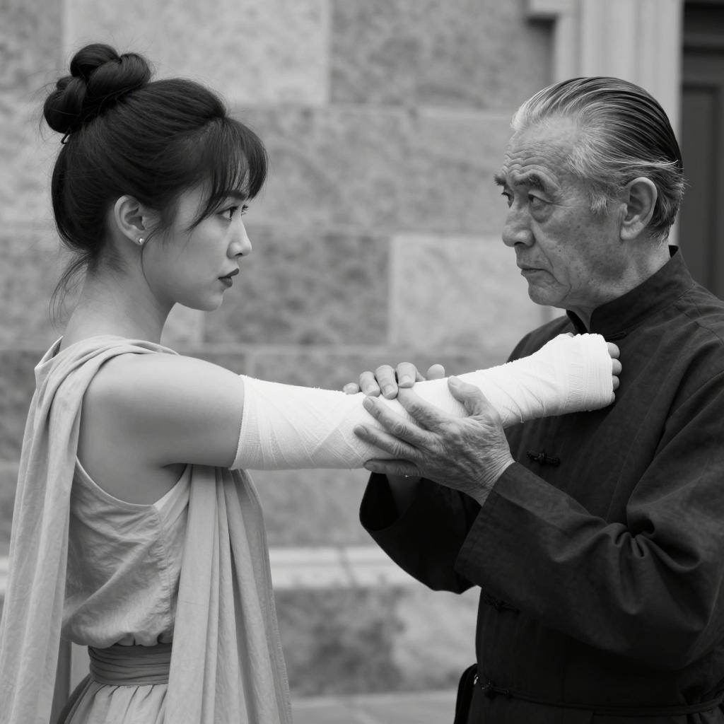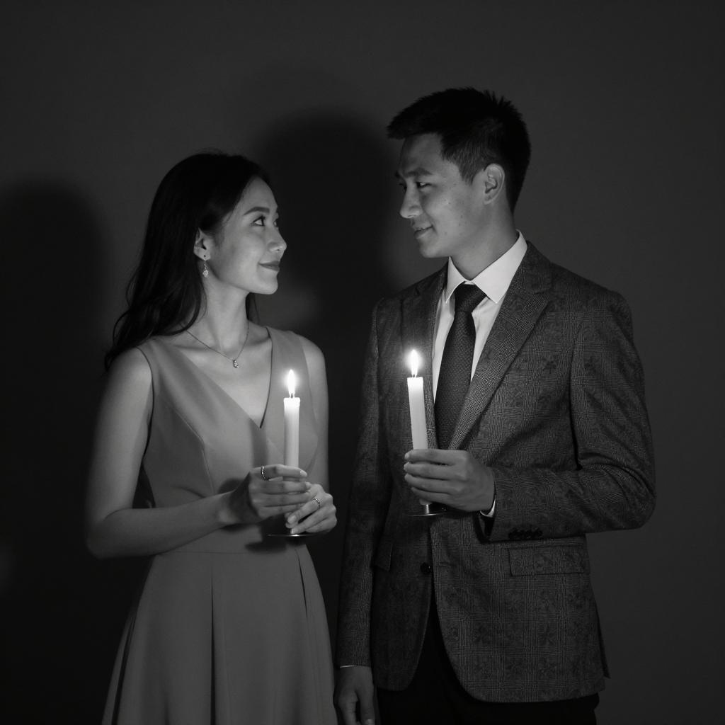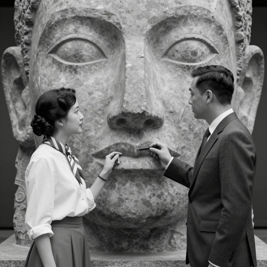 Black-and-white photograph of two people standing in front of a large, ured stone sculpture of a face. Woman on left, wearing a light blouse with a striped scarf, and high-waisted skirt, faces the man. Man on right, wearing a suit, holds an object close to the sculpture's mouth. Both look at the sculpture. Stone face in background has large, expressive eyes and a pronounced nose. Woman's hair is styled in an updo. Man's hair is short and neatly combed.