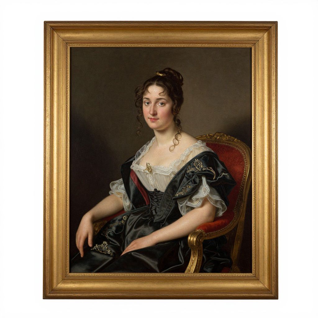 Elegant gold frame encasing a classical portrait of a lady, rendered in rich hues with intricate detailing, set against a dark background and seated upon a red upholstered chair.