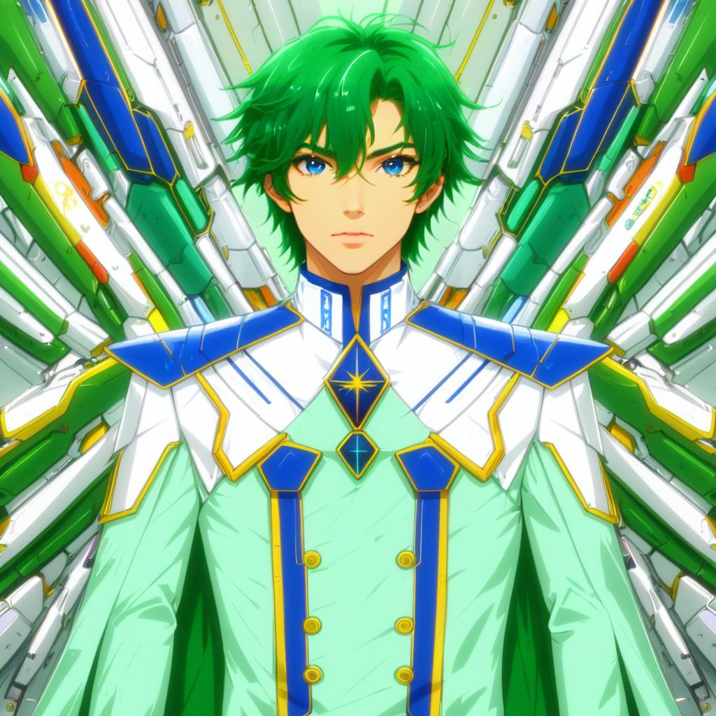 Digital anime-style portrait of Allelujah Haptism from Gundam series, featuring heterochromia with striking blue eyes and vibrant green hair. Character is dressed in a detailed Celestial Being uniform in shades of white, blue, gold, and green, standing against a mechanical, futuristic background reminiscent of Gundam technology.