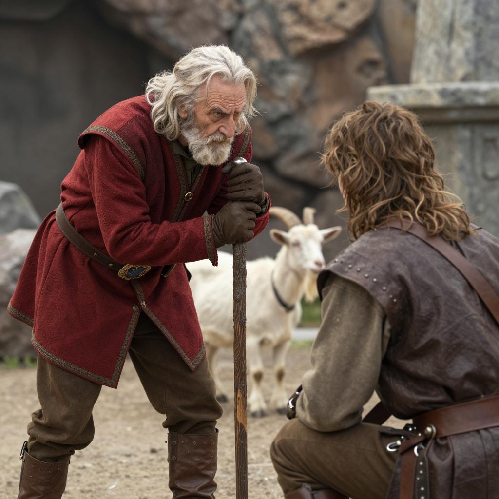 Old man in red, ornate, medieval-style clothing with brown gloves and boots, leans forward, gripping a staff, looking intently at a young man with long brown hair, wearing a brown, leather tunic. Background includes rocky terrain, a white goat, and a stone structure.