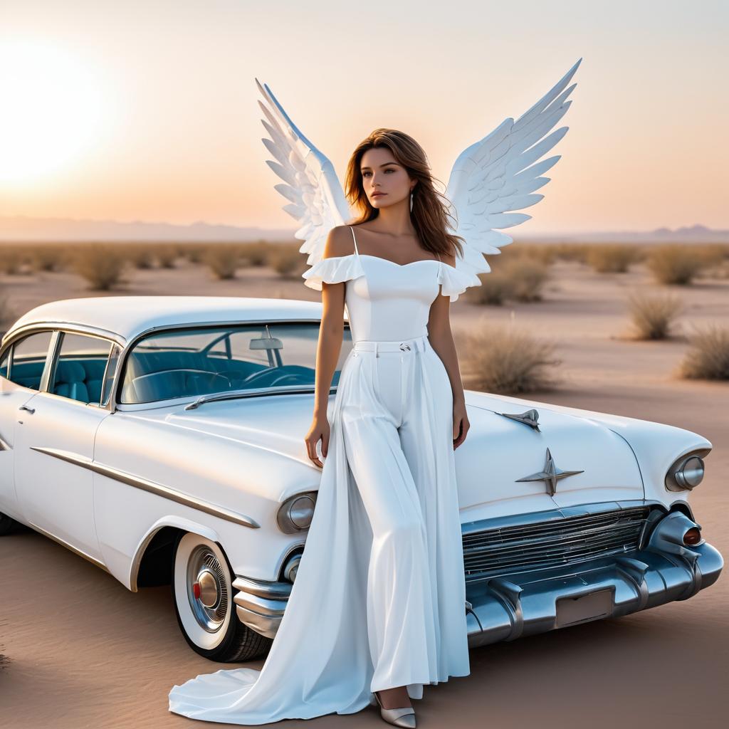 Portrait of a young woman wearing white off-shoulder top and wide-leg pants, accessorized with large white angel wings, standing beside a classic white 1950s car in a desert setting at sunset. The scene captures a blend of fashion and fantasy with a serene and contemplative mood, highlighting the contrast between the ethereal angelic wings and the rugged desert environment.