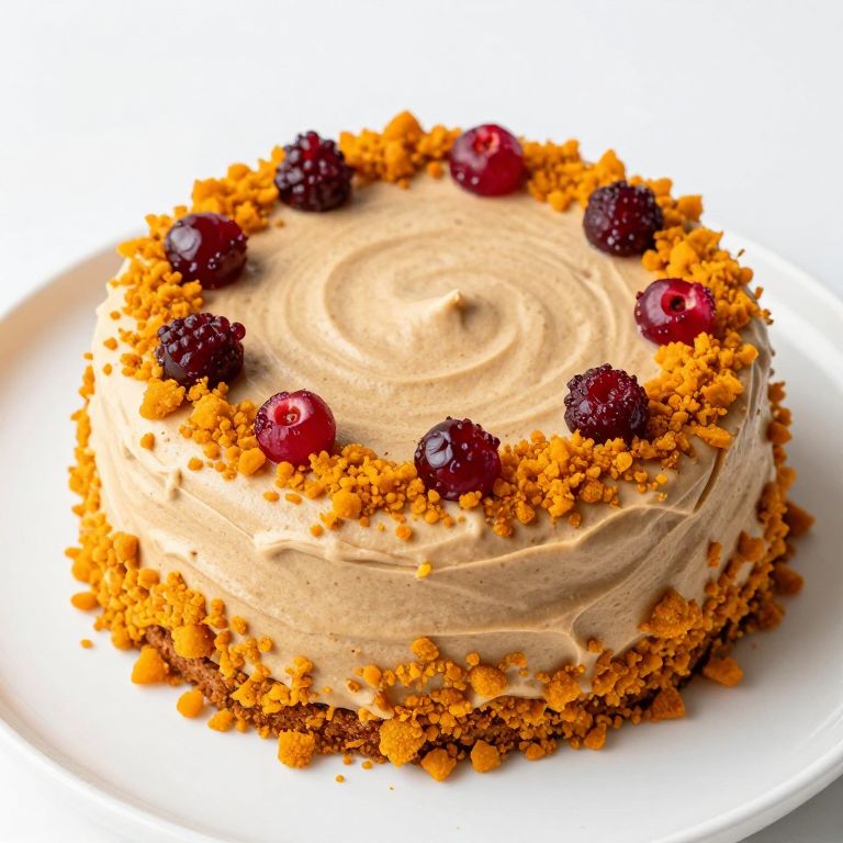 Delicate brown butter cake topped with smooth biscoff frosting, encircled by vibrant orange cardamom crumbs, and dotted with cranberry curd accents, inspired by Momofuku Milk Bar's signature style, showcased on a pristine white plate.