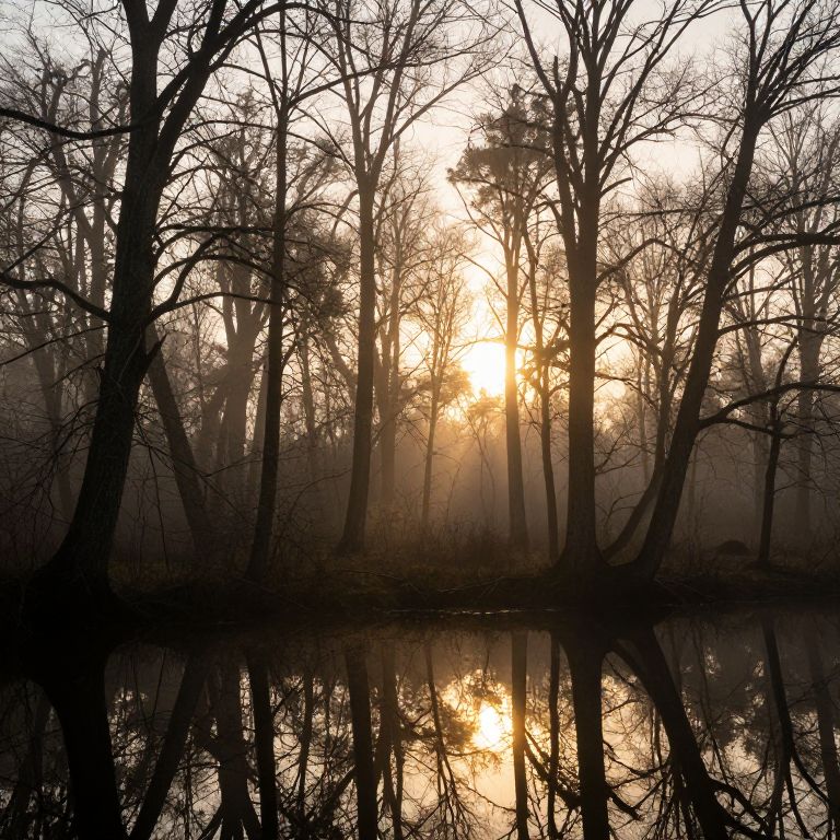 Silent twilight whispers through a dense forest where gnarled trees stand tall, their bare branches reaching skyward, mirrored perfectly in a tranquil lake below, as a soft golden sun casts its glow through the misty haze.