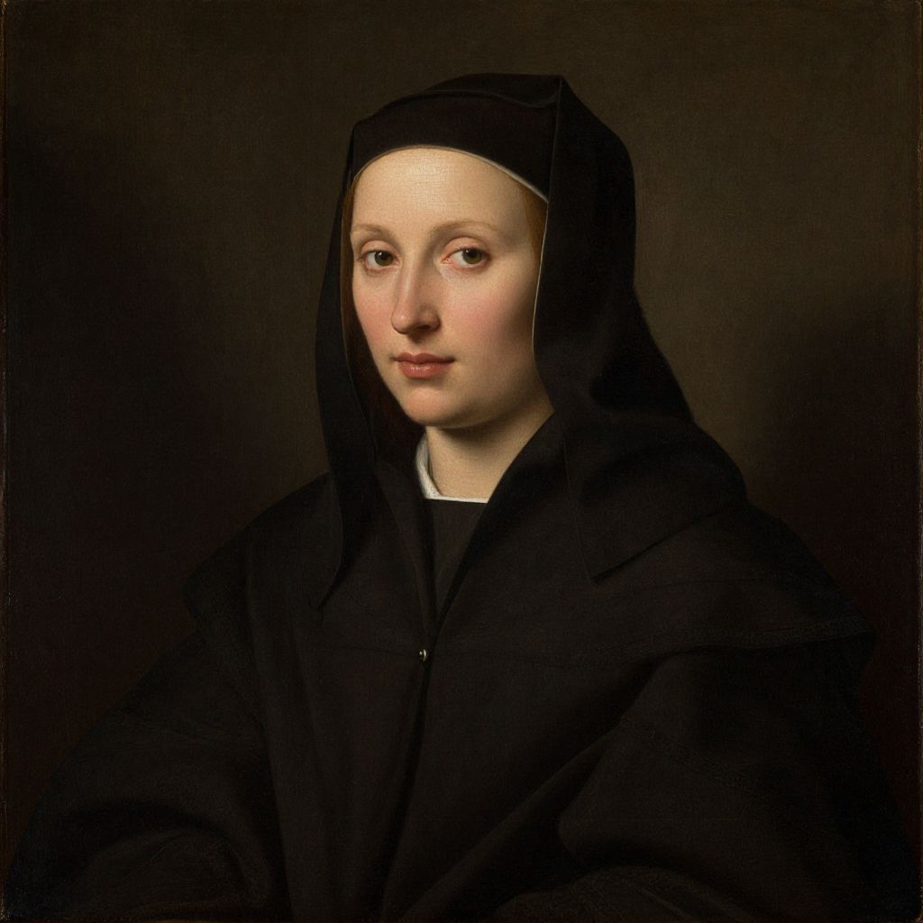 A classical oil painting in the style of Hans Memling, depicting a serene portrait of a woman in monastic attire, characterized by rich, dark tones and meticulous attention to detail, with a soft, naturalistic rendering of her features and the folds of her robe.