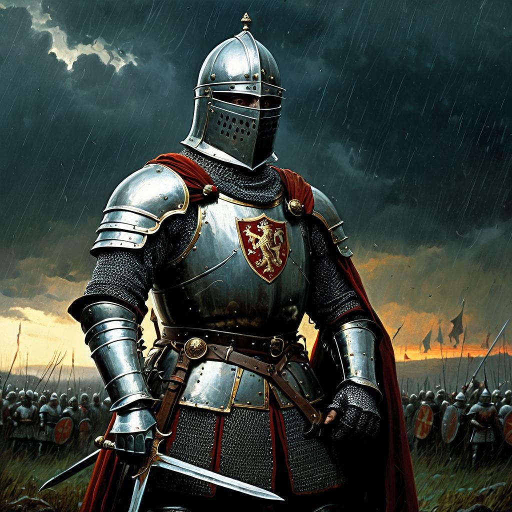 A realistic, highly detailed portrait of a medieval knight clad in full plate armor with chainmail underneath, standing on a rainy battlefield at twilight. The knight wears a polished steel helmet with a visor, a red cape, and a chestplate emblazoned with a golden lion crest. The background shows an army of similarly armored soldiers holding spears and shields, under a dramatic, dark stormy sky with patches of orange sunset light.