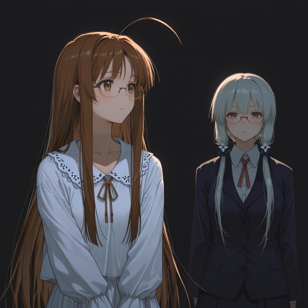 Digital artwork featuring two anime-style girls with glasses and long hair standing against a dark background. The girl on the left has brown eyes, brown hair with an ahoge, and wears a white blouse with a decorative collar and tie. The girl on the right has red eyes, silver hair in long twin braids with floral hair ties, and wears a dark blazer over a collared shirt with a red ribbon tie. The illustration is detailed with soft lighting and shadows, capturing a contemplative mood.
