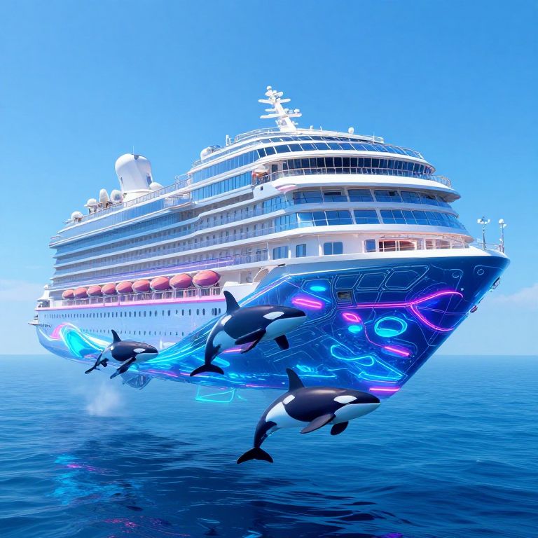 "Neo-Victorian cyberpunk neon simulation of holographic orcas in an ocean below a floating luxury cruiseliner with glass panels and a clear blue sky,"