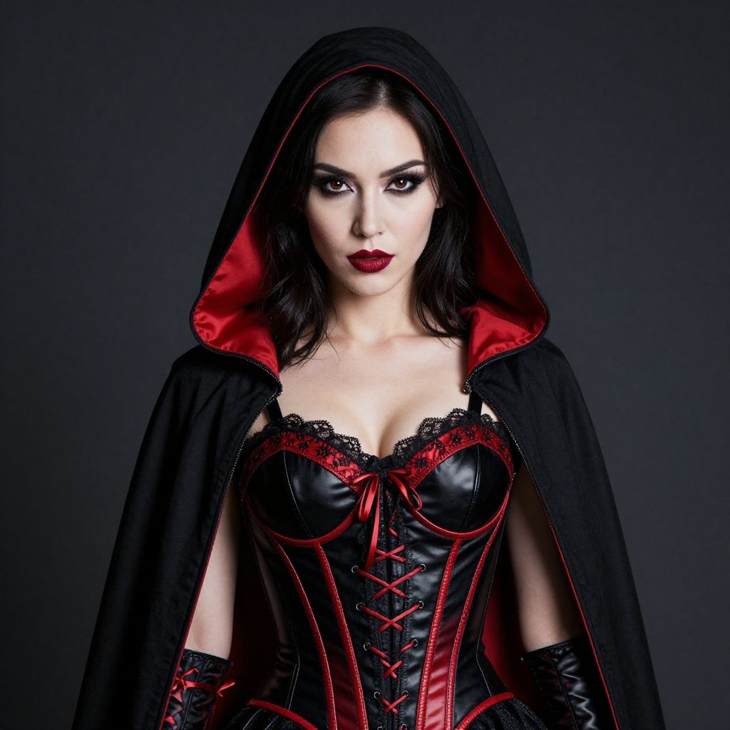 Photograph of a pale-skinned woman with dark, wavy hair and bold red lipstick, dressed in a gothic, Victorian-style outfit. She wears a black dress with puffed sleeves, a high red collar, and a white shirt underneath. The dress has black crisscross laces over a red bodice. Her intense gaze and striking makeup give her a vampy, dramatic look. The background is a solid gray.