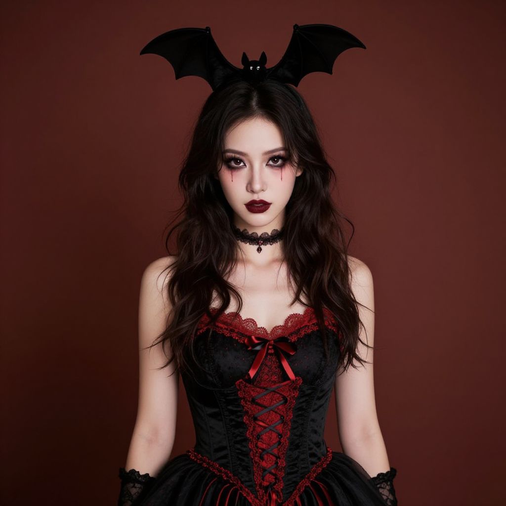 Photograph of a pale-skinned woman with striking red lipstick and dark, straight hair. She wears a black, short-sleeved, flared dress and a black cape with a vivid red lining, fastened with a black choker adorned with a white cross. Her intense gaze is directed at the camera. The dark, gradient background contrasts with her outfit, emphasizing her gothic, vampire-like appearance. The lighting highlights her sharp features and the textures of her clothing.