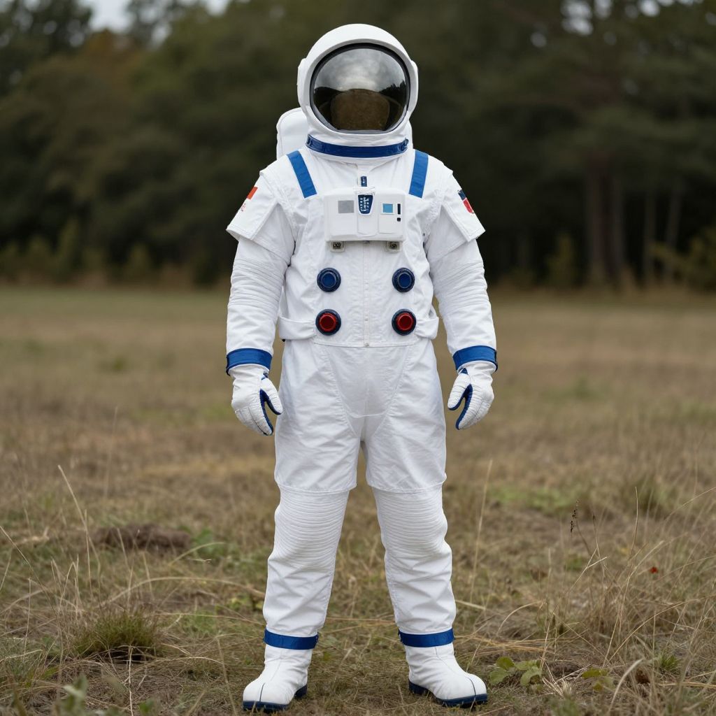 Photograph of a child in a white astronaut suit with blue accents and red buttons, standing in a grassy field with a forest background.