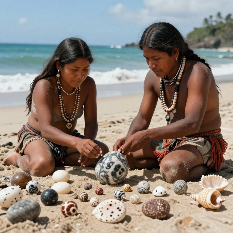 Photograph of two indigenous women with dark brown skin and long black hair, kneeling on a sandy beach. They are topless, adorned with white shell necklaces and red and black patterned skirts. They are examining a black and white patterned ball among various seashells and small sea creatures. The turquoise ocean and blue sky with scattered clouds form the background. The women's focused expressions and the natural, earthy textures of the beach create a serene, cultural scene.