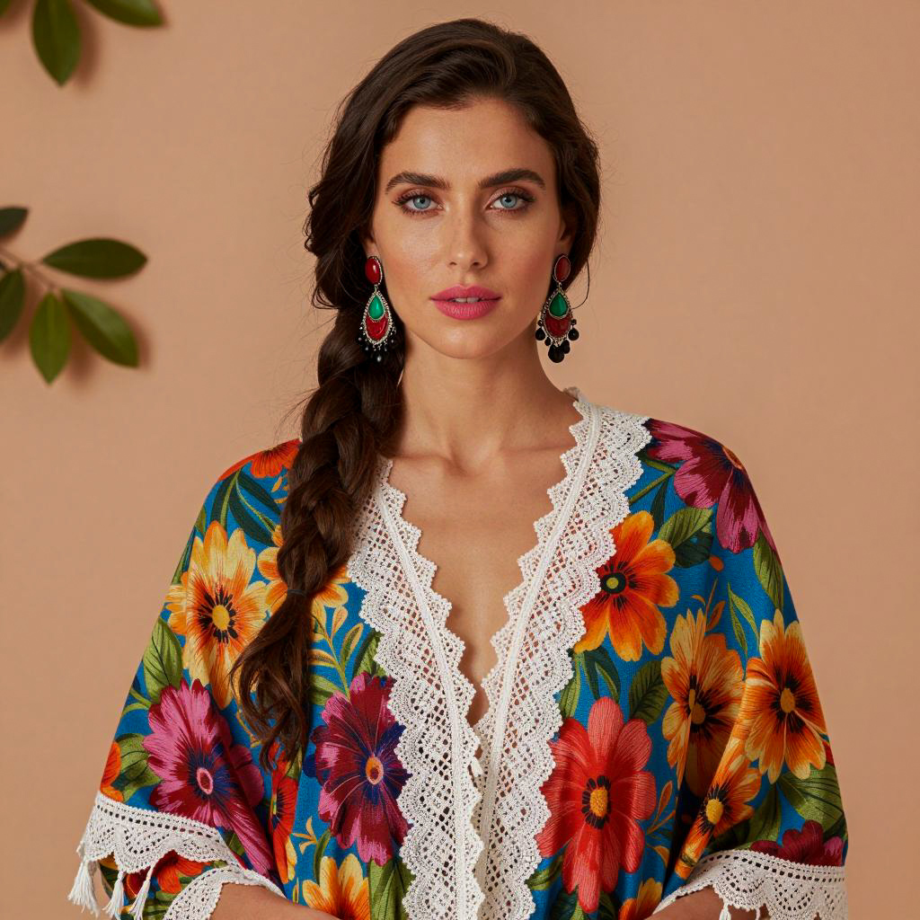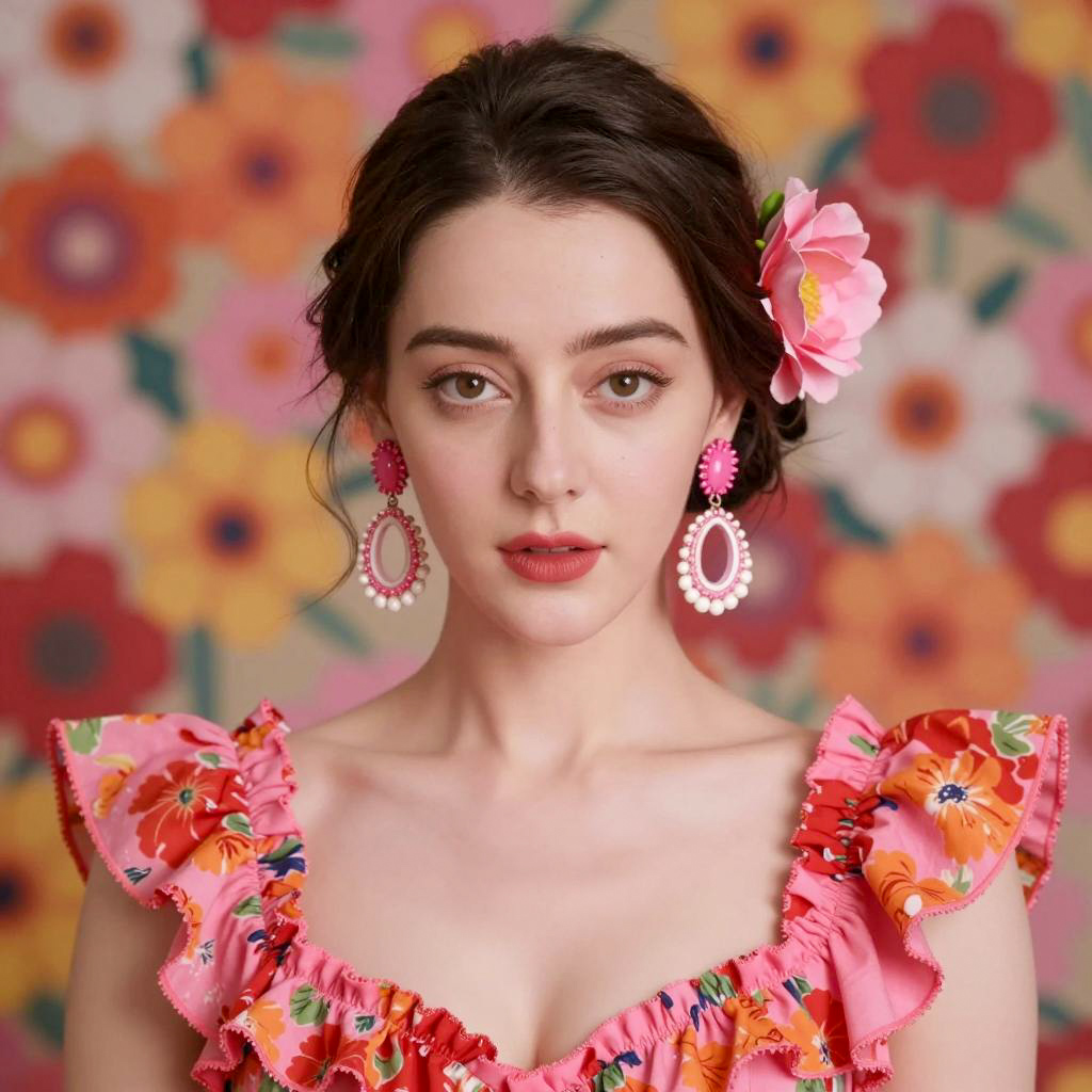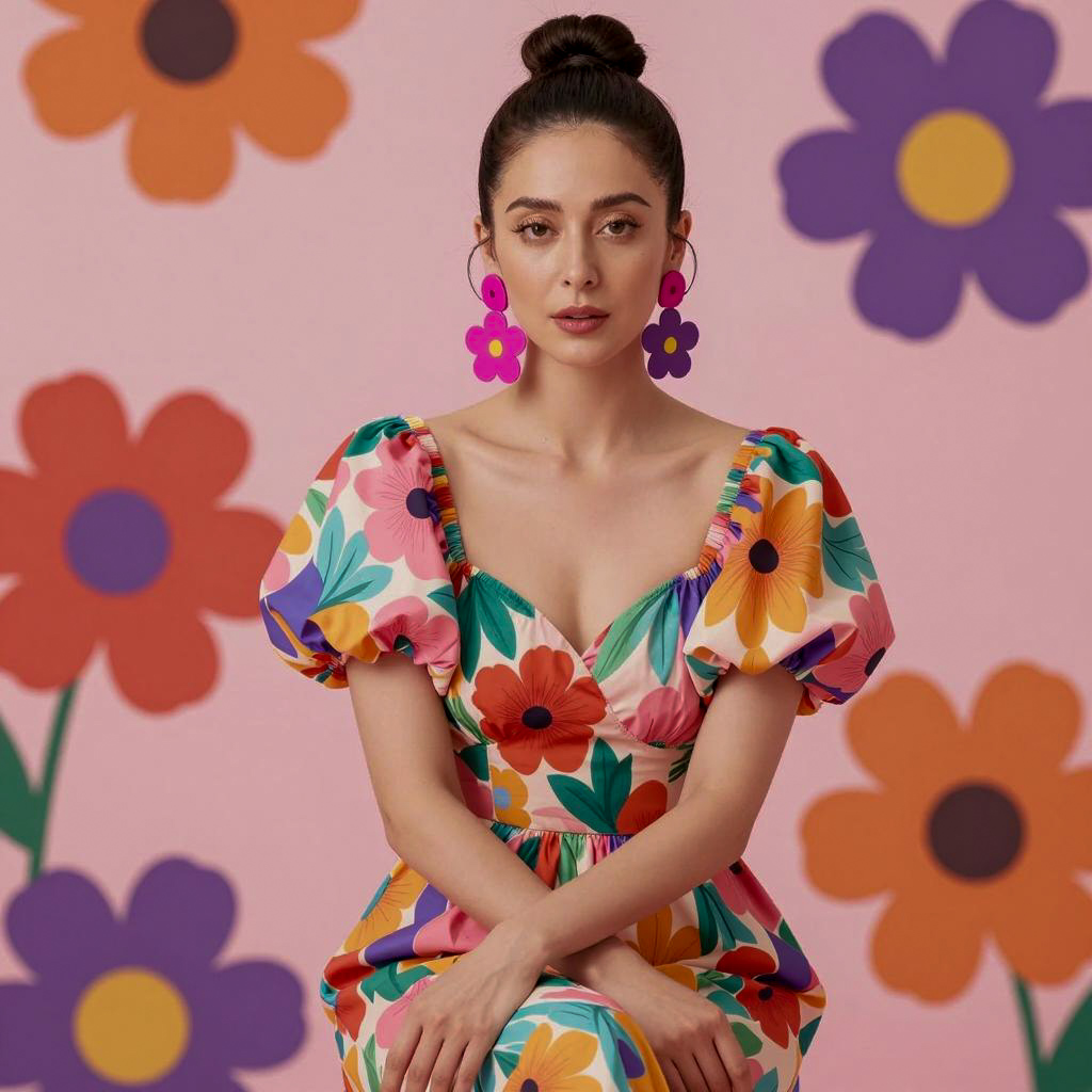 Photograph of a woman with dark hair in a sleek bun, wearing a colorful floral dress with puffy sleeves, large pink and purple flower-shaped earrings. Pink background with large orange, red, and purple flowers. She sits with hands resting on her lap, neutral expression. Bright, vibrant colors dominate the image.