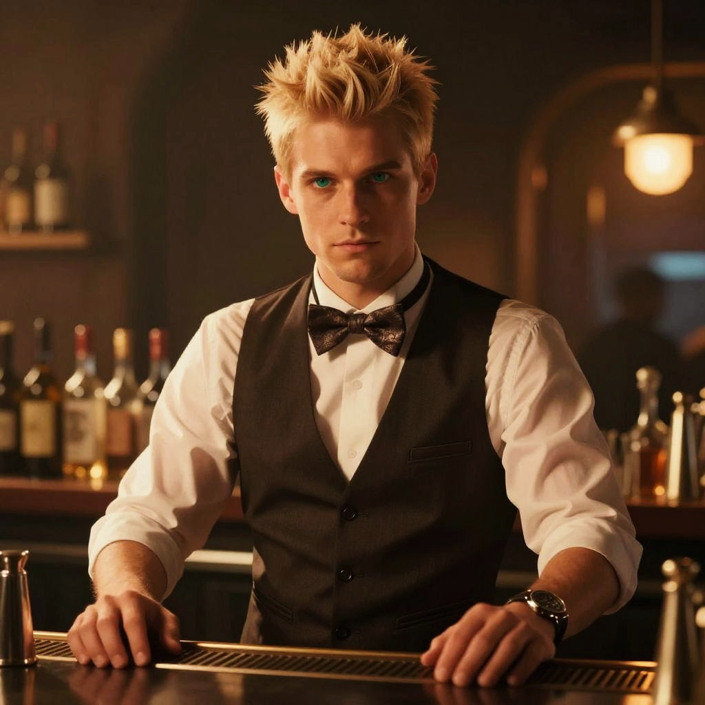 A cyberpunk bartender, an Argentinian female in her early 30s, with long dark curly hair with subtle cybernetic implants, wearing a silky midnight blue waistcoat and glowing bowtie. Set in a futuristic bar with reflective violet neon with atmospheric haze, highly detailed in 4K.