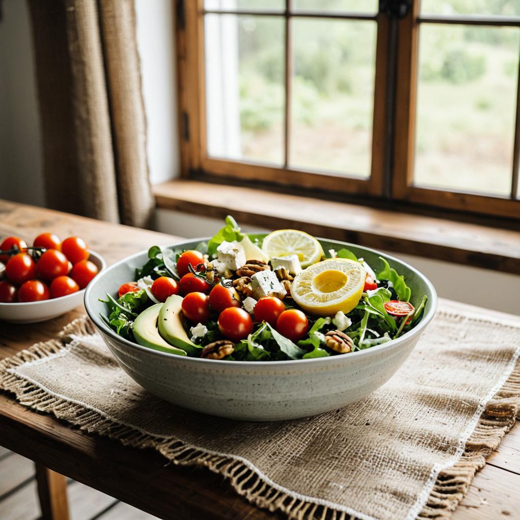 Present a colorful salad bowl with mixed greens, cherry tomatoes, avocado slices, toasted walnuts, and feta cheese topped with a lemon vinaigrette on a rustic farmhouse table adorned with a burlap runner near an open window with lace curtains, captured in natural light photography, fine art realism with a shallow depth of field.