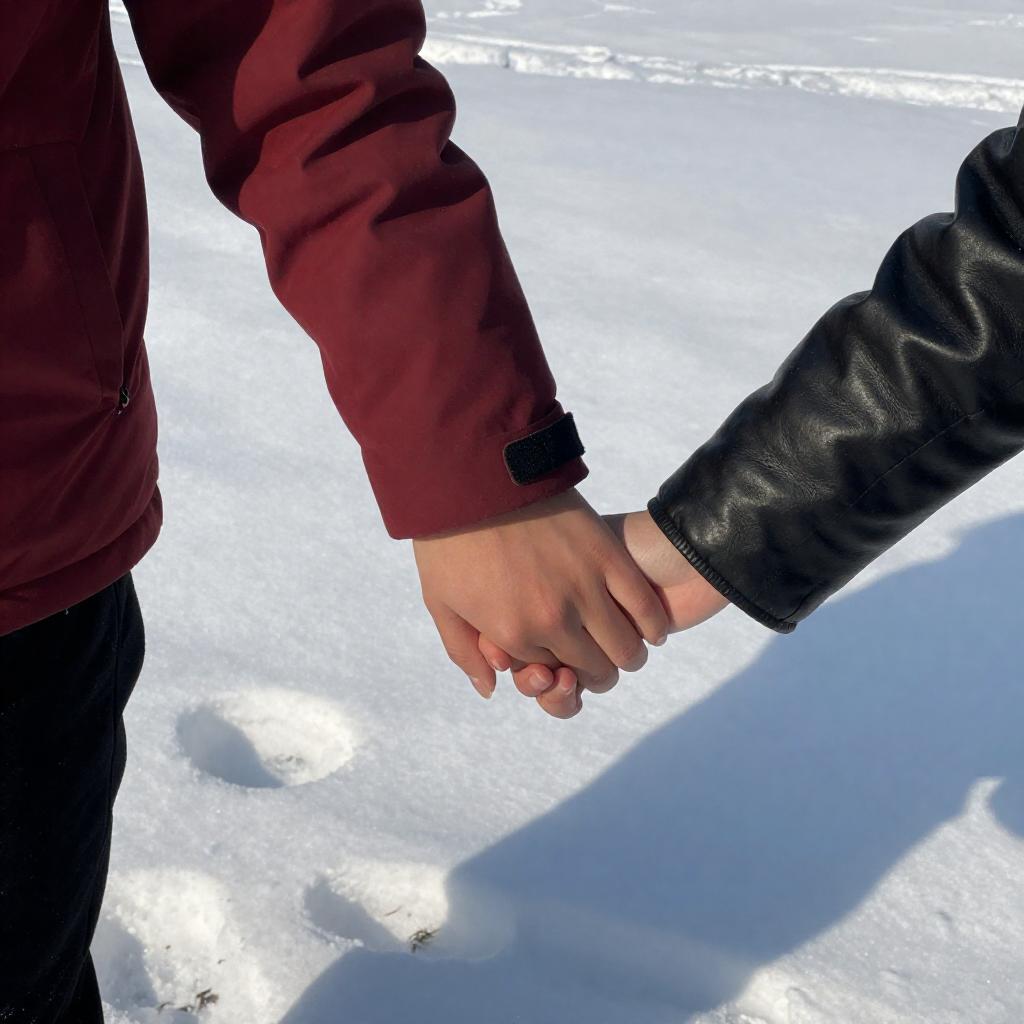 Close-up photograph of two people holding hands outdoors on a snow-covered ground. One person is wearing a dark red long-sleeved jacket, and the other is wearing a black leather jacket. Shadows are cast on the snow, emphasizing the cold winter setting.