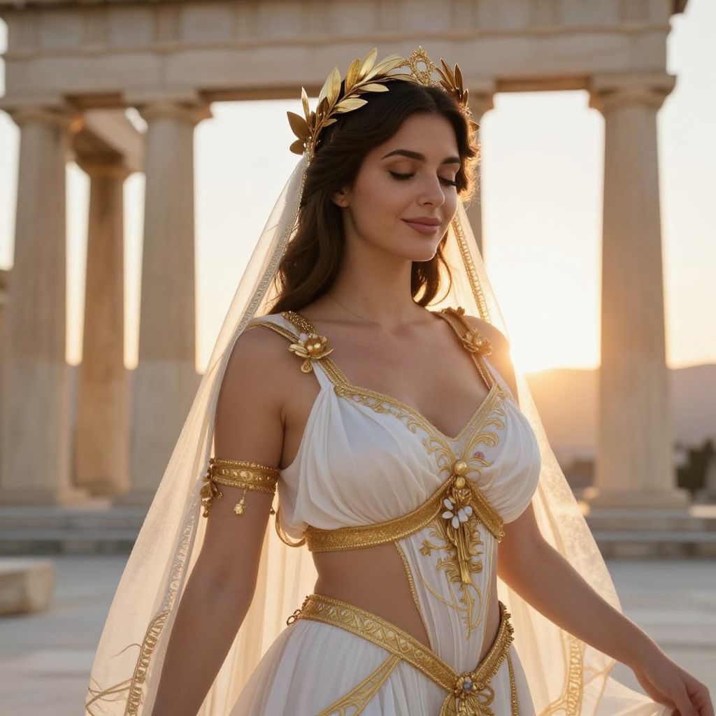 A realistic photorealistic portrait of a woman in an elaborate Aphrodite Venus costume, wearing a flowing white and gold dress with ornate floral patterns, a sheer fabric veil draped over her shoulders, and a golden laurel wreath on her head, standing in a sun-drenched classical Greek temple with marble columns and a sunset behind her, her face soft and radiant with a natural smile, eyes closed in serene beauty, glowing lightly in the golden hour light.. The woman has big breasts and cute face