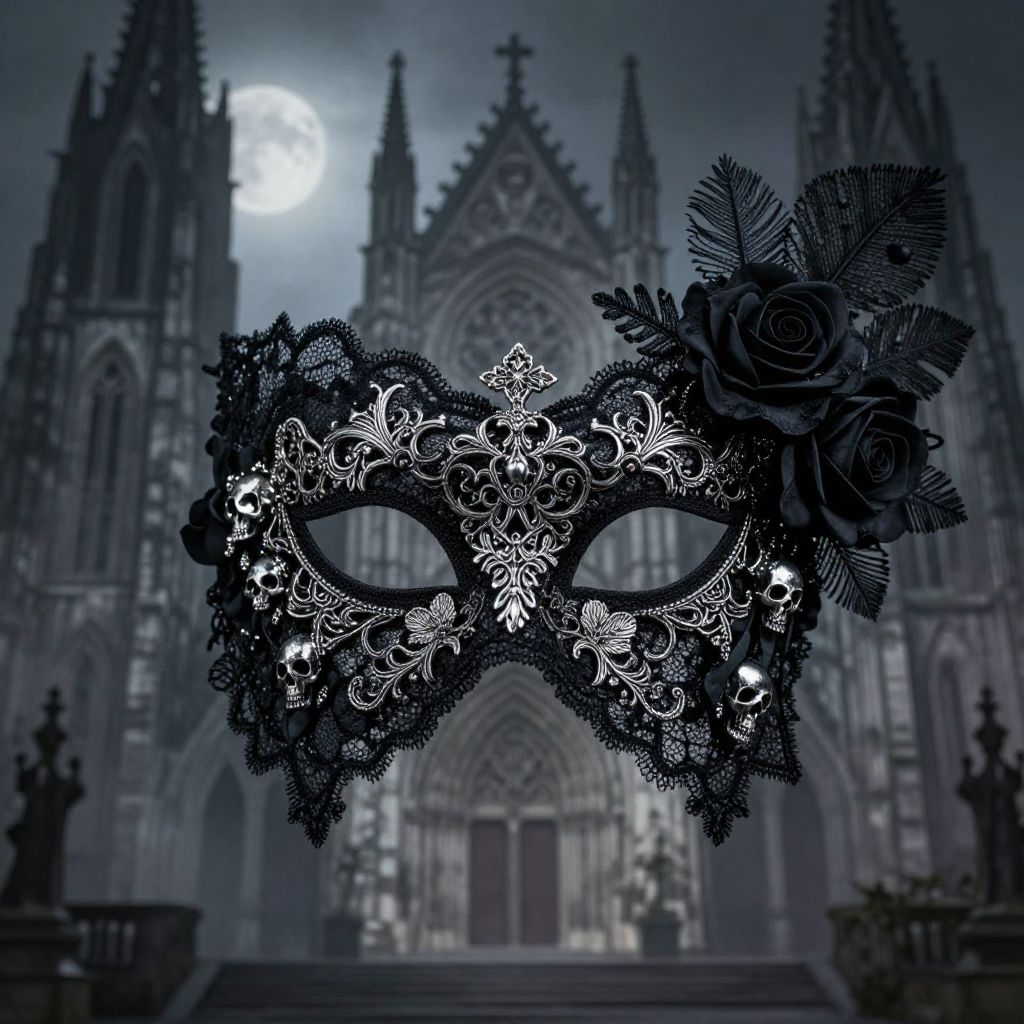 Gothic face mask intricately designed with black lace and silver filigree, adorned with dark roses and subtle metallic skull motifs, set against a misty, moonlit gothic cathedral background, evoking a mysterious and elegant aura.
