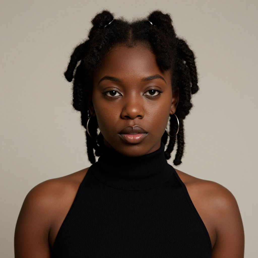Frontal butterfly locs, dreadlocks, solo, dark skin, 1girl, very dark skin, jewelry, earrings, dark-skinned female, halterneck, black hair, sleeveless turtleneck, lips, turtleneck, hoop earrings