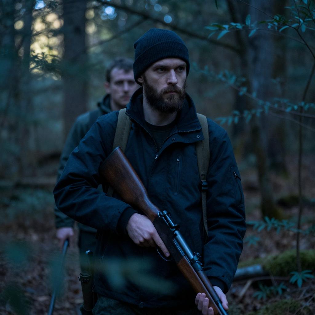 Photograph of a bearded man in a dark jacket and beanie, holding a rifle, standing in a dense forest. He has a serious expression and is partially obscured by blue-tinted foliage. Another figure is slightly visible behind him. Sunlight filters through the trees, creating a dramatic, blue-tinged atmosphere.