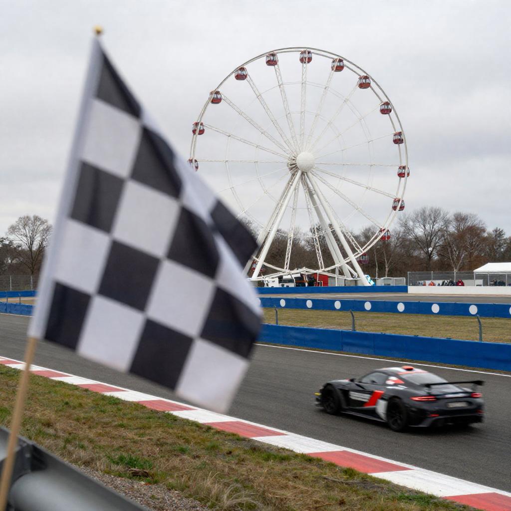 Photograph of a racetrack with a blurred black and white checkered flag in the foreground, a speeding car on the right, and a large Ferris wheel in the background. The track is lined with blue barriers displaying white . Overcast sky, leafless trees, and a fence on the left.