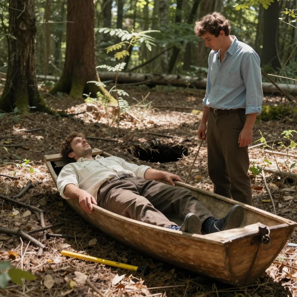 Two men sitting on a bunk bed. The man on the left has light brown hair, a gray suit, and white shirt, focusing on a wooden box. The man on the right has a red headscarf, brown beard, beige vest, and light green shirt, holding a green glass bottle. Shadows on the wall. Bunk bed frame and gray mattress visible.